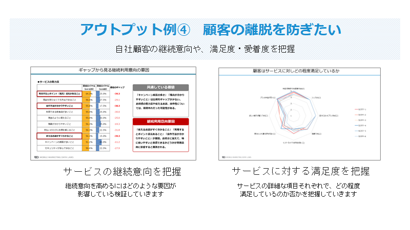 顧客データ(会員情報、行動履歴)とアンケートを組み合わせて、顧客分析を行い、「サービス側の価値」と「ユーザー側が求めるベネフィット」のギャップを分析します。その分析を元にロイヤルカスタマーにインタビュー(N1分析)を行い、新規獲得、継続促進、満足度向上、退会防止などの改善策をクライアントと伴走するプロジェクトになります。