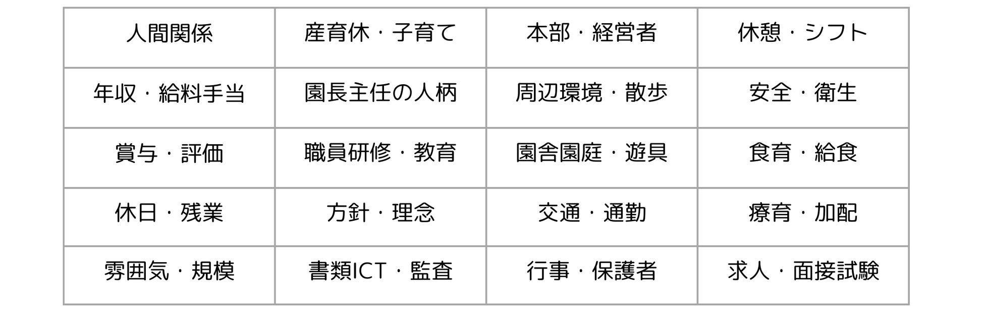 (人間関係、雰囲気・規模、年収・給料手当、賞与・評価、休日・残業、産育休・子育て、職員研修・教育、方針・理念、周辺環境・散歩、園舎園庭・遊具、交通・通勤、行事・保護者、書類ICT・監査、求人・面接試験、休憩・シフト、本部・経営者、安全・衛生、園長主任・運営、食育・給食、療育・加配)