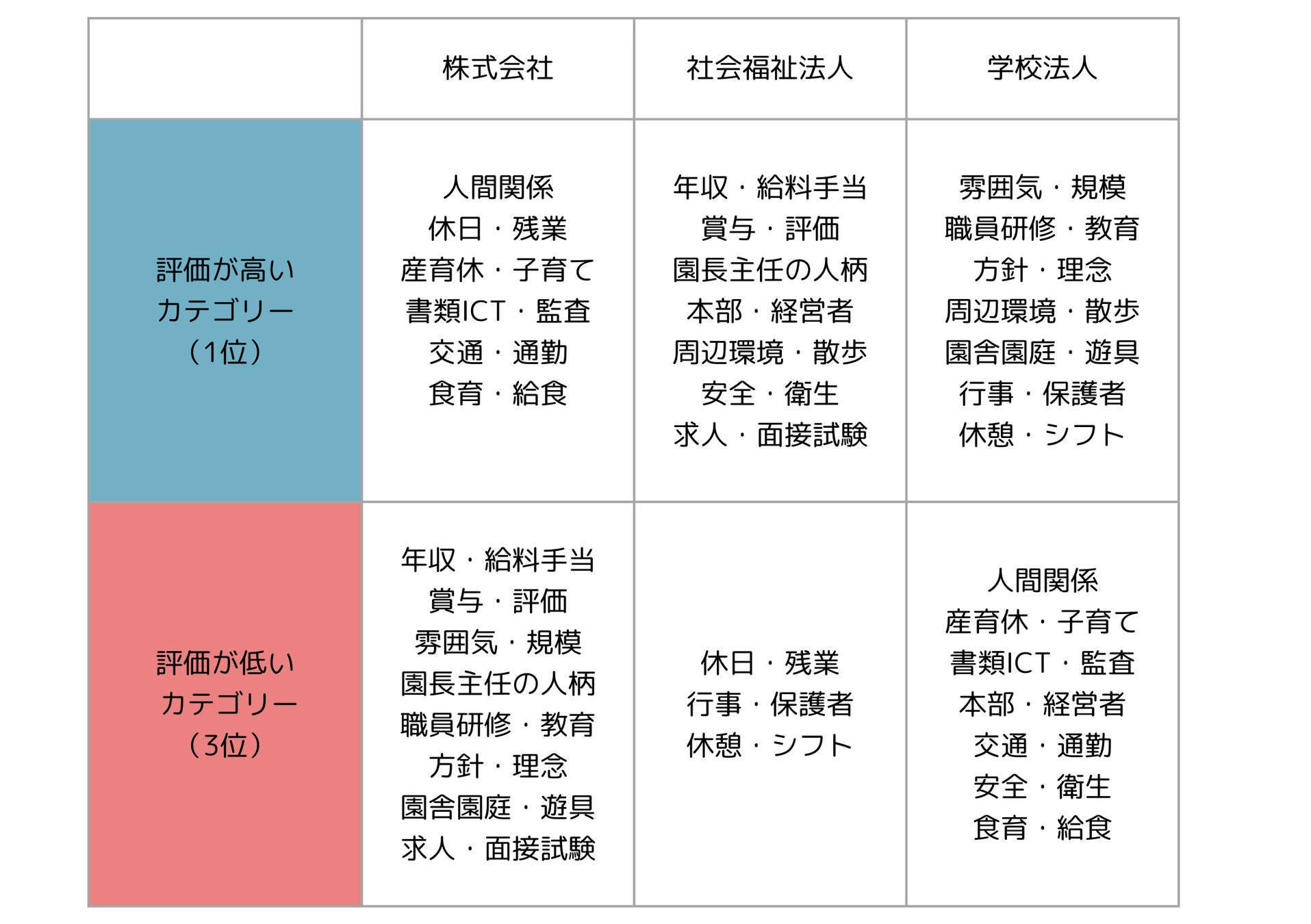 本調査では、全口コミの中から50代の保育士が投稿した口コミだけを調査対象とし、20個の口コミカテゴリーごとに、保育園・幼稚園を運営する「株式会社」「社会福祉法人」「学校法人」の評価点数を比較しています。そして、「1位(青色)」「2位(黄色)」「3位(赤色)」の色付けを行い、それぞれの職場の強み・弱みといった特徴を整理しています。(参考情報として公立の保育園・幼稚園を運営する「自治体」も公開)