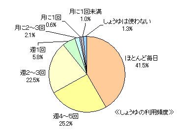自宅でのしょうゆの利用頻度は「ほとんど毎日」が41.5%を占め、「週4~5回」「週2~3回」が各2~3割となっています。利用頻度は女性や高年代層で高くなっています。毎日利用する人は、10・20代では2割ですが、50代以上では5割強と年代差が大きくなっています。また、東北と北陸では他の地域よりも利用頻度が高い傾向です。