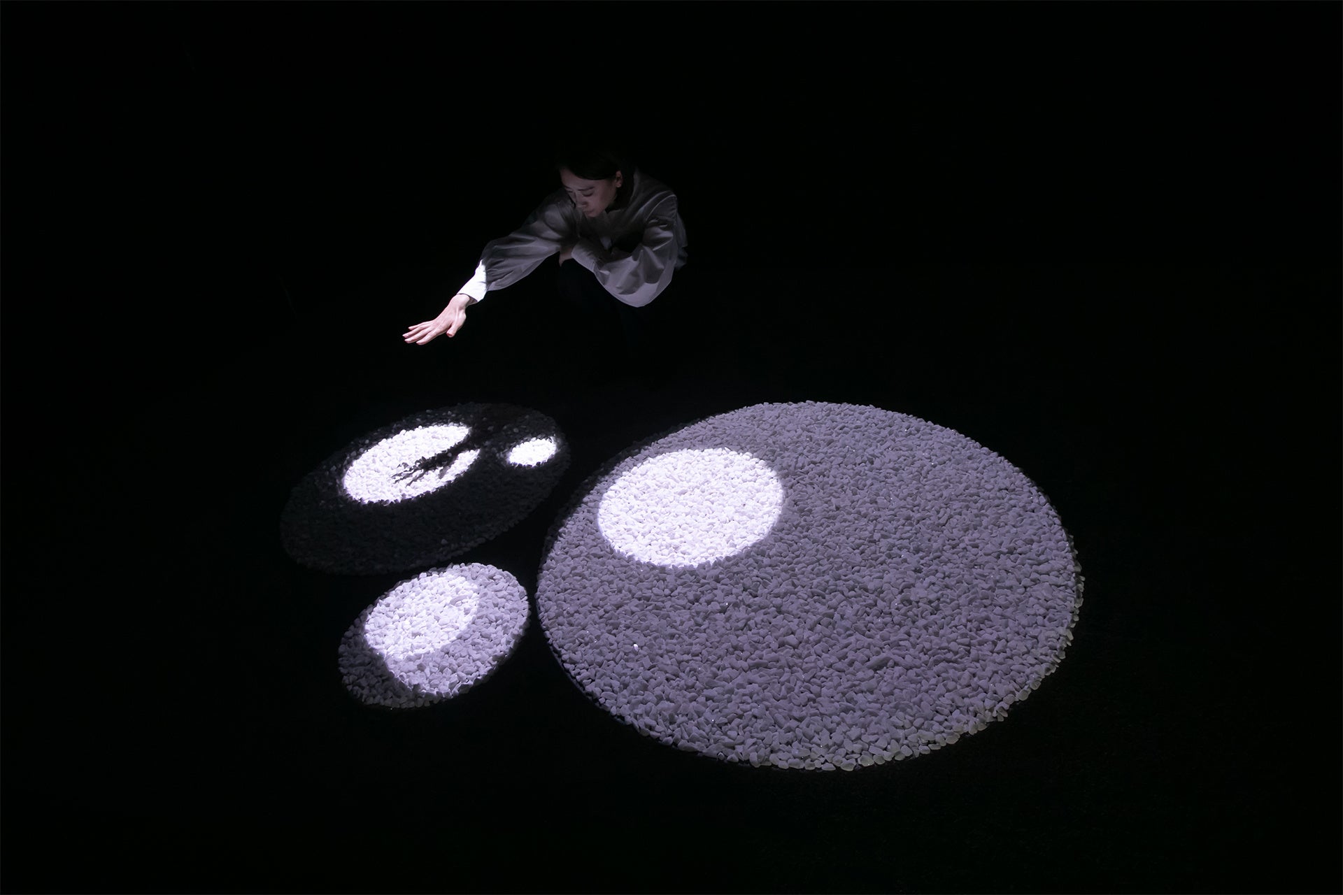 円形に敷き詰められた白い砂利の各地点にアルファベットが割り振られており、その配置に合わせて、ライトが月の海の名前を照らし出すという作品です。変化するライトの光は、白い砂利の上に本物の月のようなイメージを描き、鑑賞者に視覚的な宇宙体験をもたらします。この作品を通じて、作家は、感覚や感情といった個人的なものではなく、共通の記号や法則をもとに自動生成された普遍的なイメージを構築しています。それは、実際の構造体を生み出す過程に、もはや意味/アイデアの創造主としての人間がいらないのではという疑問を我々鑑賞者に投げかけるとともに、意味やアイデアという核が形骸化していく予兆とも捉えられます。