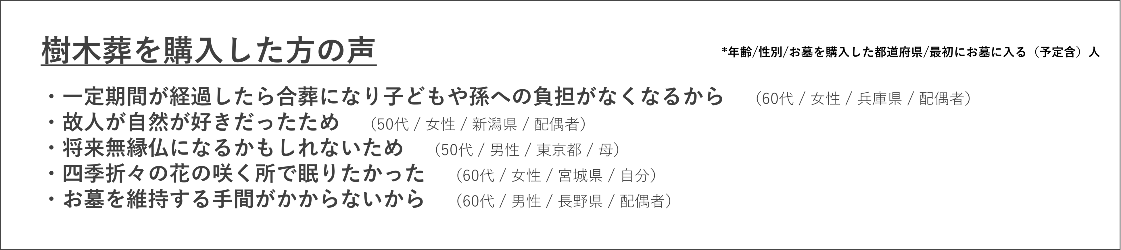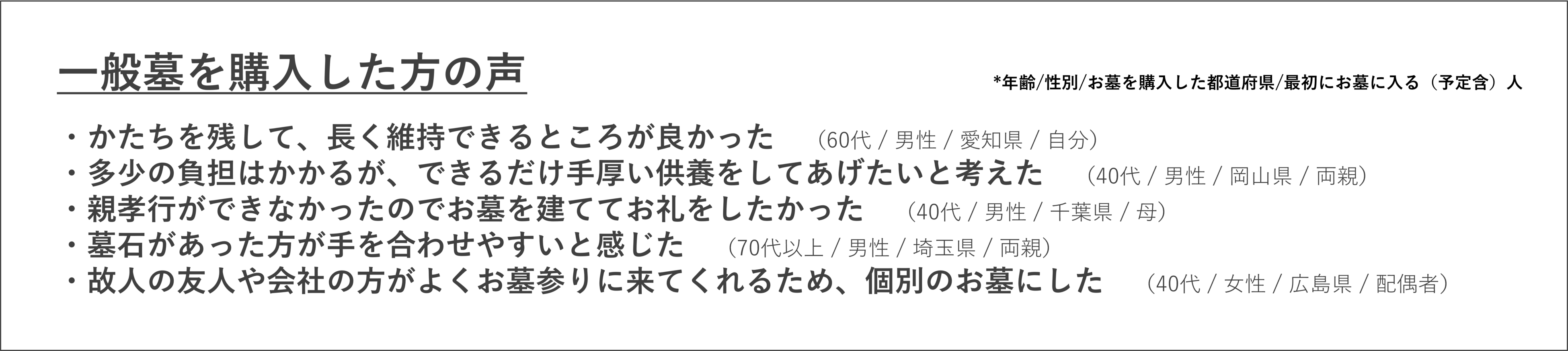 一般墓は基本的に将来的に他の方と合祀されることがないため、手厚い供養ができ、家族のつながりをより強く感じることができる点が魅力です。一般墓の購入者の声によると、一般墓は近年「心のよりどころとなり、故人と今を生きる人々をつなぐ」役割を担っていることが伺えます。