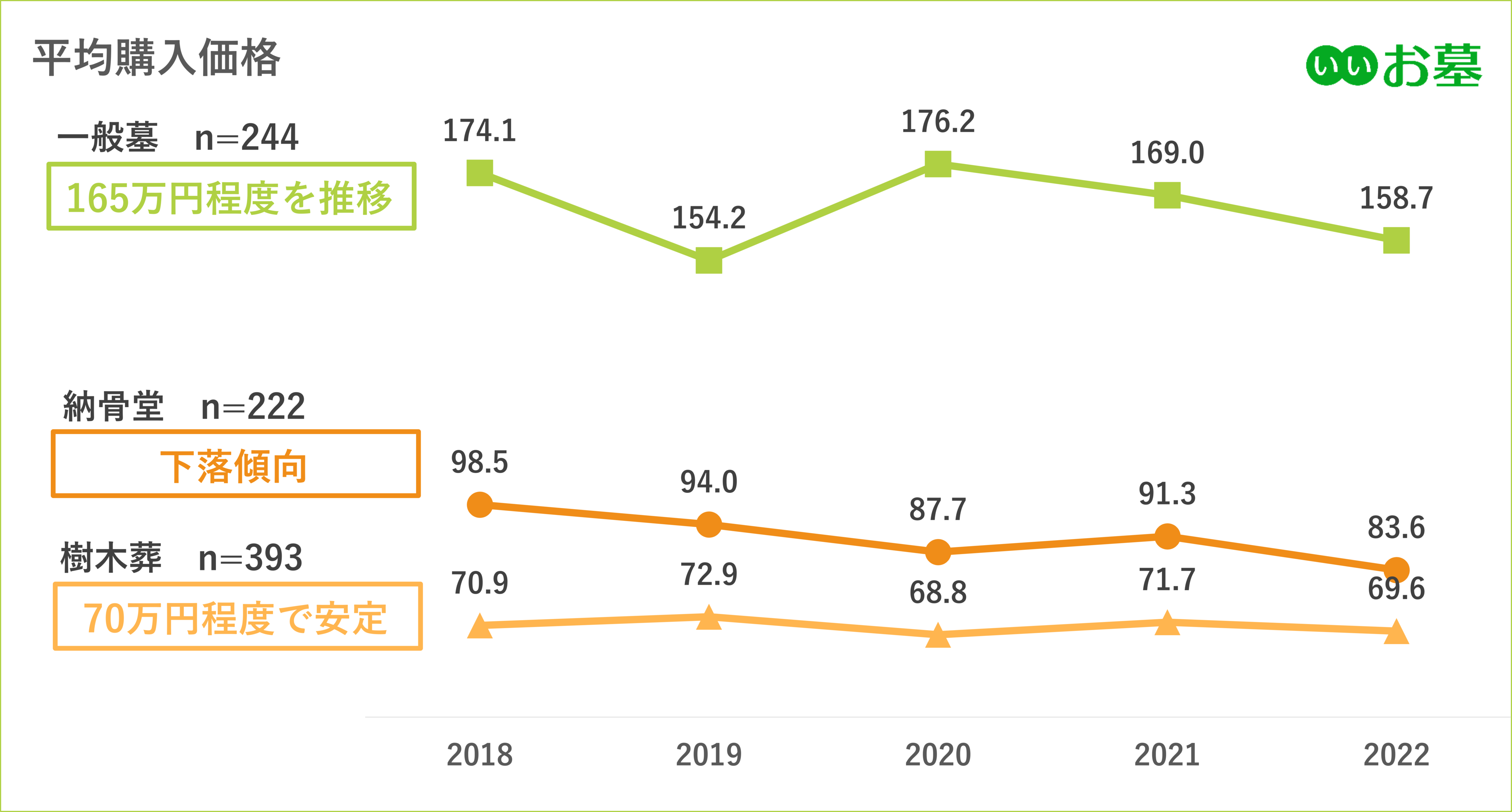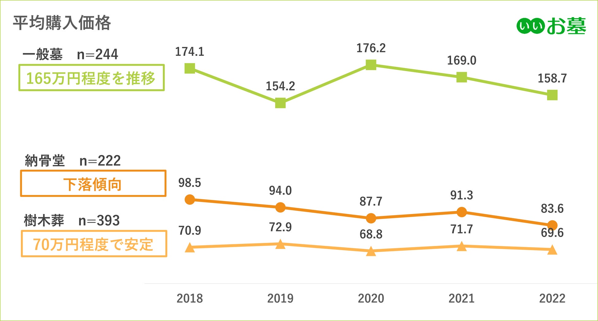 一般墓158.7万円、樹木葬69.6万円、納骨堂83.6万円