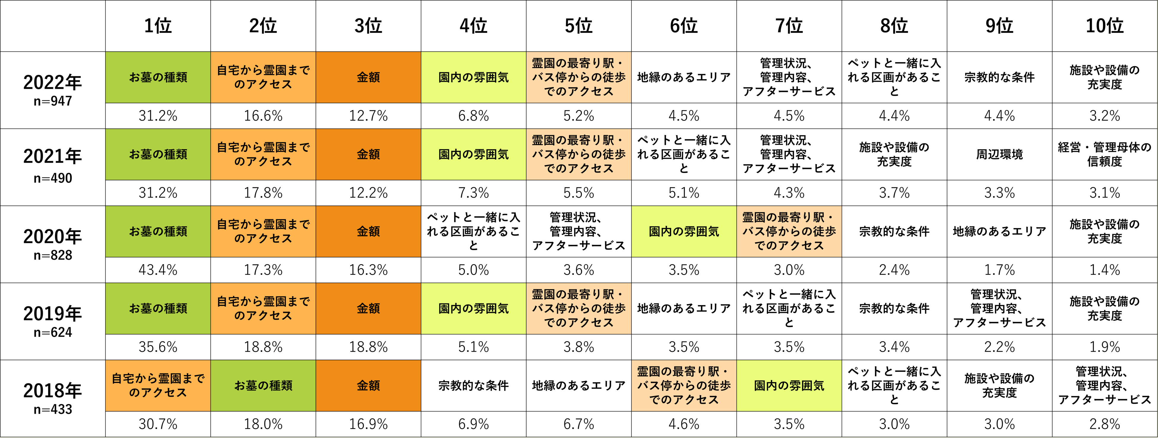 一方で1999年に登場した樹木葬は、長い年月を経て2020年、初めて最も選ばれる存在になりました。未婚率や核家族化が進む日本において、樹木葬や納骨堂のような「跡継ぎ不要のお墓」は消費者のニーズを捉えていることが伺えます。