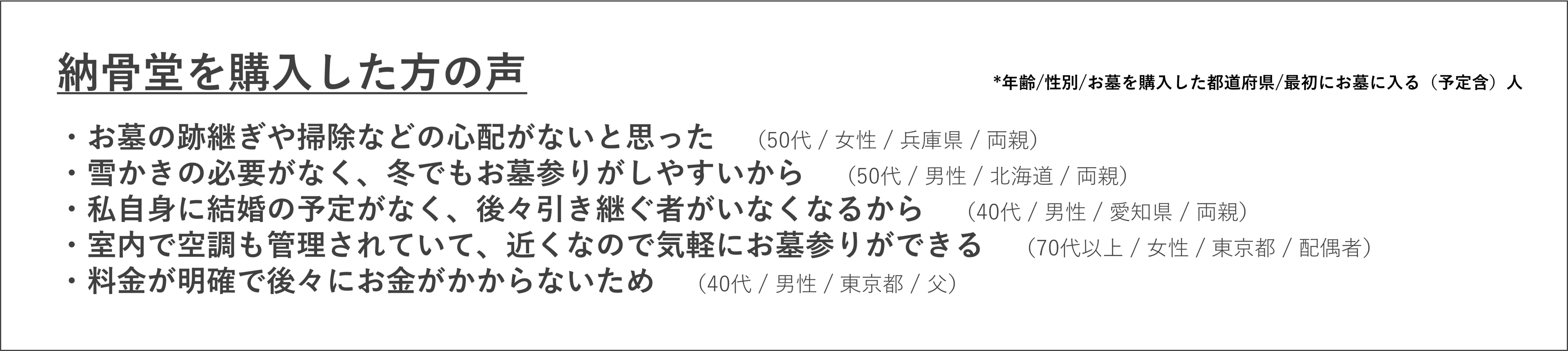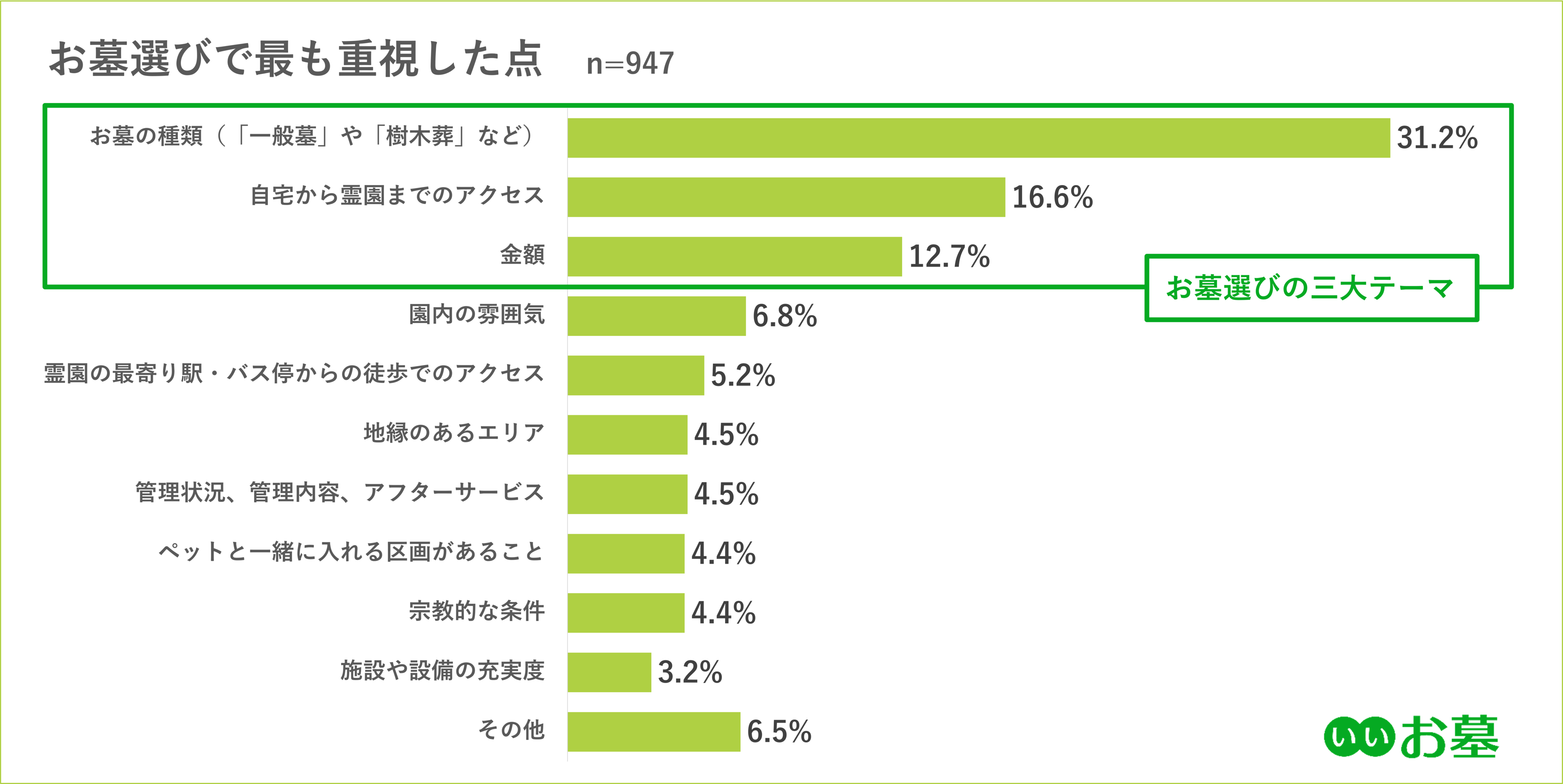 一生に一度ともいえる大切なお墓の購入において、お墓探しの専門家である当社ができることは、お客様センターやインターネットを介した質の高い情報の提供と、個々の状況に合わせた適切な提案です。これらを追求することで、お墓を通じた「家族のつながり」や「心のよりどころ」を創出するお手伝いをしたいと考えています。当社では、「いいお墓」を利用し、既にお墓をご購入された方の声を届けることで、これからお墓探しを始める方の一助になりたいという思いから、毎年「お墓の消費者全国実態調査」を実施しています。