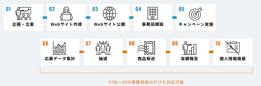 当社では、制作業務・広告運用・事務局として当選者選定から商品発送まで一気通貫で対応させて頂いております。