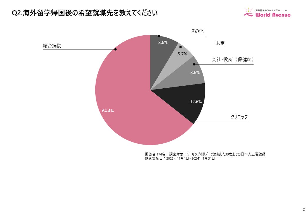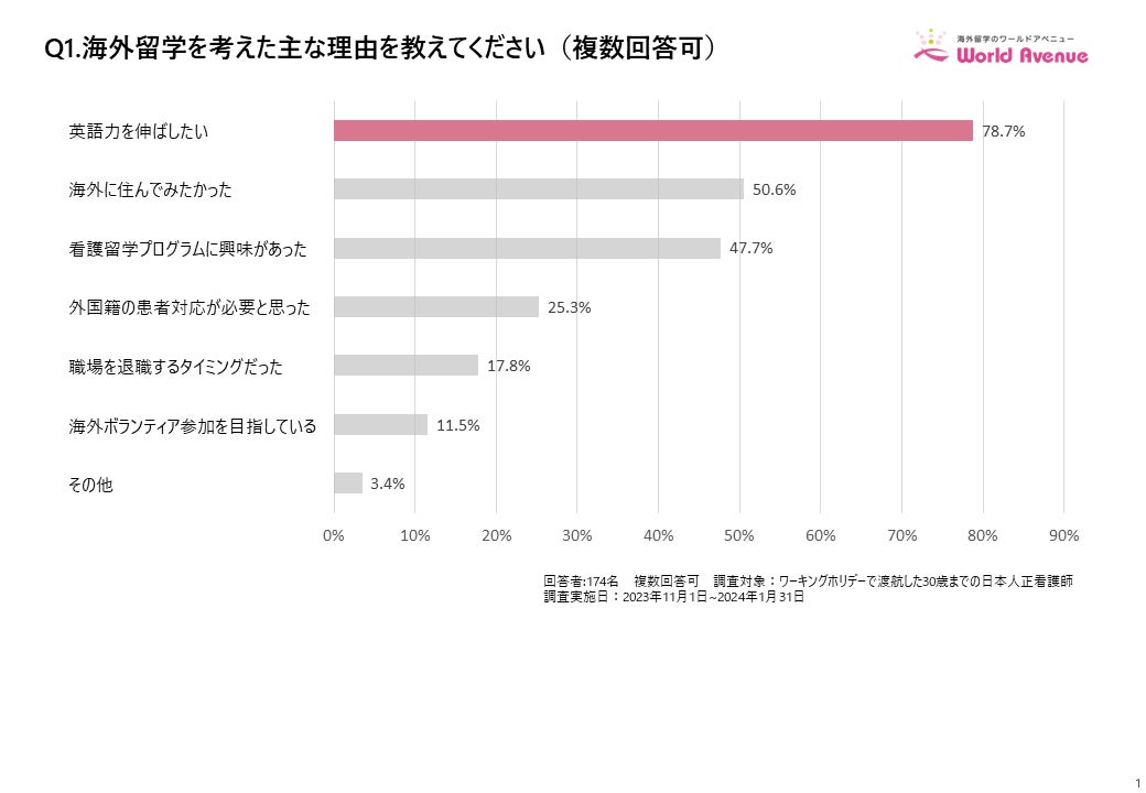海外留学支援を行う株式会社ワールドアベニュー(所在地: 東京都新宿区、代表取締役社⻑: 松久保 健太)は、直近2年以内にワーキングホリデーを経験した22歳~31歳の正看護師資格を持つ174名を対象に、留学の理由及び帰国後の就職先に関する実態調査を実施したことをお知らせいたします。
