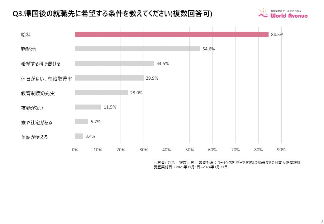 ワーキングホリデーで渡航した日本人看護師への実態調査:84%が帰国後の就職先に求めるのは「給与」でありつつ、「勤務地」や「診療科」、「有給取得率」を重視していた。