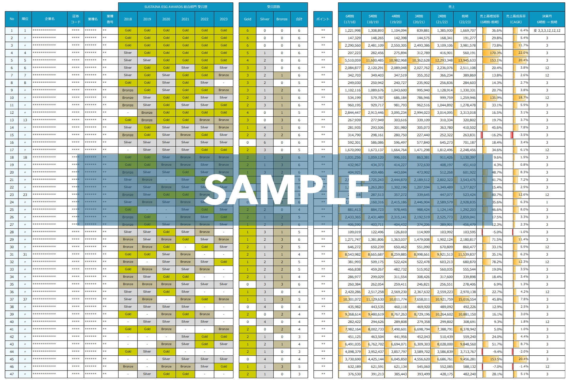 【掲載内容】:企業名、証券コード、業種、業種番号、各受賞クラス(ゴールド、シルバー、ブロンズ)をポイント化したランキング、2018年~2023年の受賞歴一覧、各クラス受賞回数、受賞歴を基にしたポイント数、6期間の決算月、売上高、売上高増加率(6期前/前期)、売上年平均成長率(CAGR)、当期純利益、前期利益率、6期平均利益率、純資産、純資産増加率(6期前/前期)、総資産、総資産増加率(6期前/前期)、ESGレーティング(2023年8月31日時点。上場企業のみ)、サステナビリティ関連ページURLとタイトル、ベンチマークデータの出典元URL、基準日2017年12月29日と最終日2023年8月31日の株価と株価増加率及び株価指数に占めるウエイトとウエイト増加率、検証時の上場企業191社とTOPIXの月足株価(2017年12月末~2023年8月末)、「サステナビリティ経営推進企業」の株価指数データを掲載。