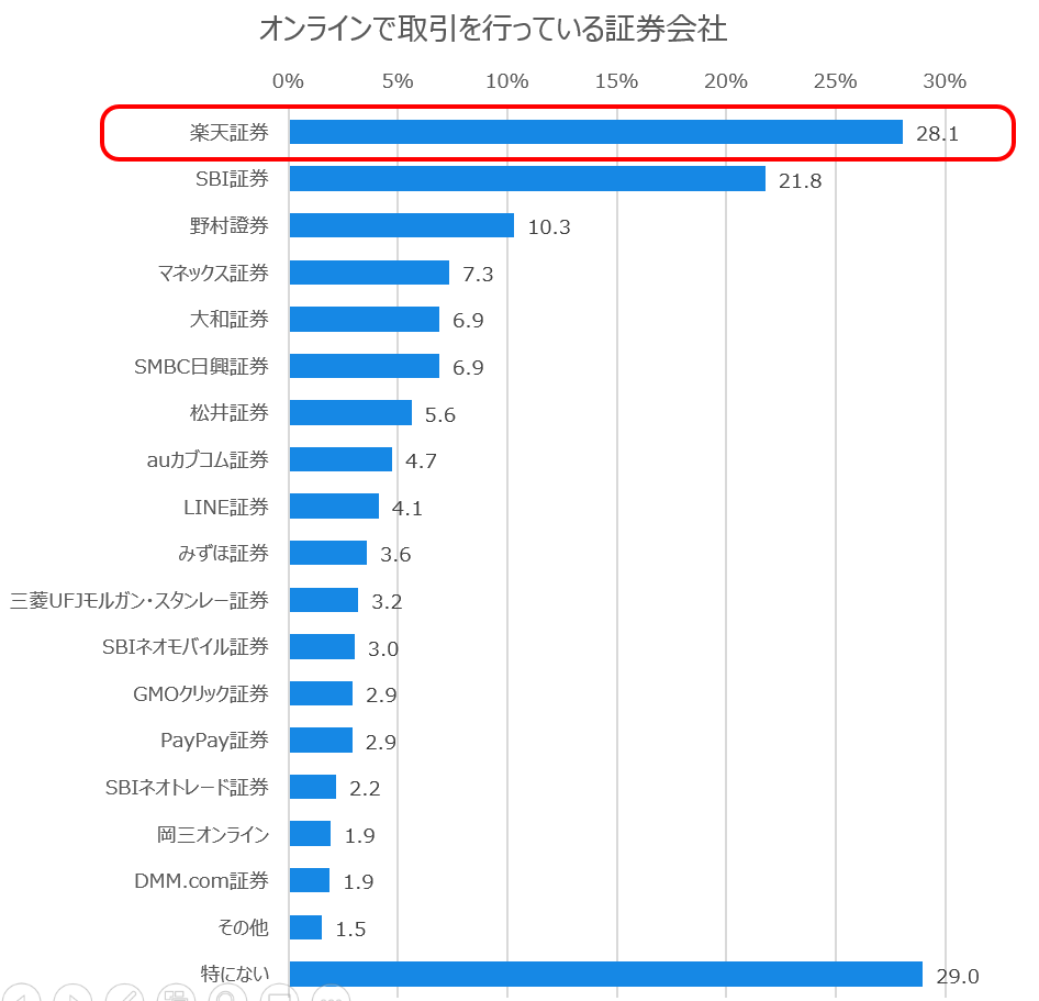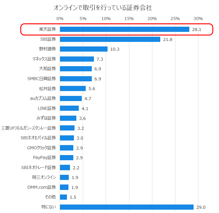 「最もオンラインで取引されている証券会社」は楽天証券が28.1%で最多となりました。