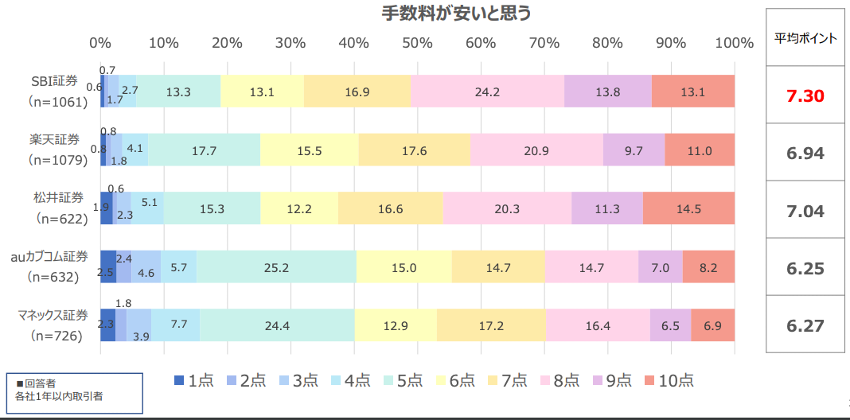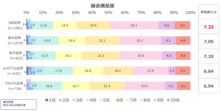 「安心して取引できる」「取引しやすい」「分析ツールが使いやすい」といずれも高い評価を得ているSBI証券が、総合的な満足度についても平均ポイント7.23で1位。次いで、7.10の松井証券、7.05の楽天証券という結果になりました。