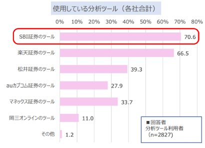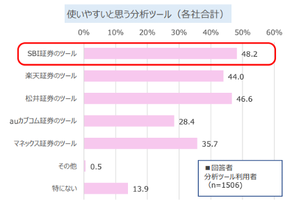 最も使用されているのはSBI証券の分析ツールで、70.6%もの人が使用していました。SBI証券のツールは、「使いやすいと思う分析ツール」でも48.2%で1位となっており、多くの投資経験者から使いやすさを評価されているようです。