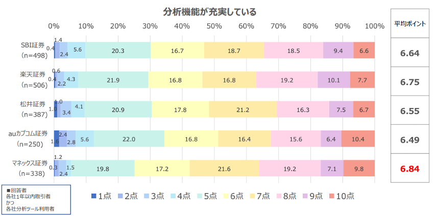 一方、「チャートが見やすい」「分析機能が充実している」「高度な分析にオススメ」など、分析ツールの内容に関する多くの項目で1位となったマネックス証券の分析ツールは、上級者に支持されている様子がうかがえます。