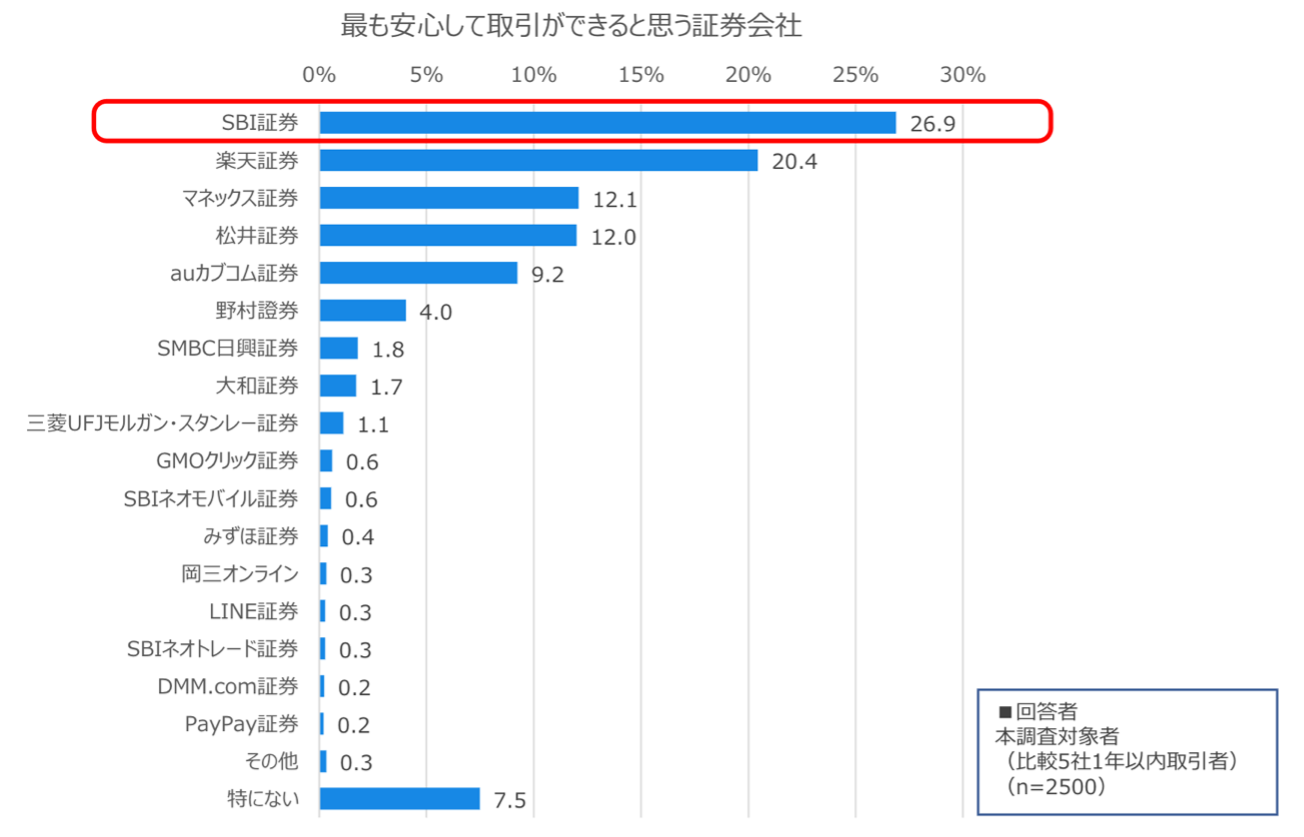 「最も安心して取引ができると思う証券会社」の1位は26.9%でSBI証券でした。
