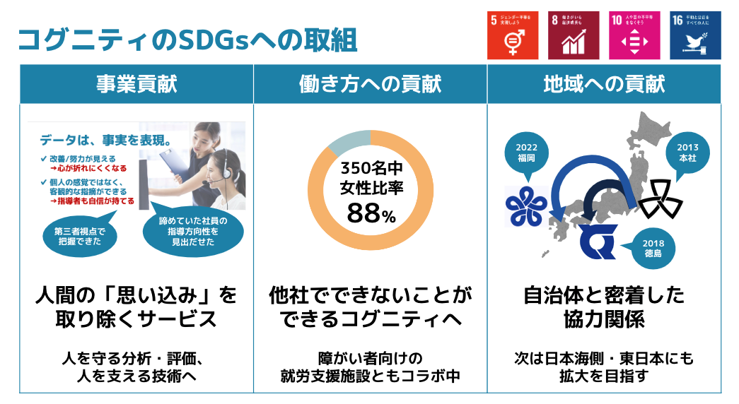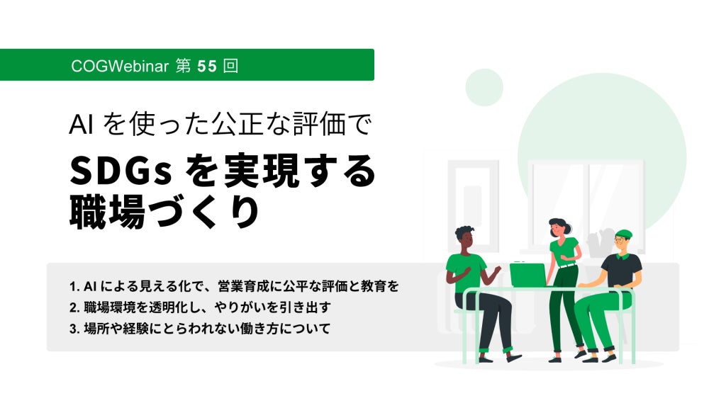 6月14日(火)14:00より、当社のSDGsへの取り組みを紹介するウェビナーを開催します。本プレスリリースにも掲載の「事業貢献」「働き方への貢献」「地域への貢献」について、視聴者が取り入れ方法をイメージできるよう具体例を挙げながら解説します。COGシリーズで見える化されたレポート、実際の従業員の働き方・感想、評価については行動指針の内容についても公開します。本ウェビナーは創業から9年、紆余曲折を経て創り上げた現在の当社を紹介する初の試みとなります。コグニティは今後も「事業」「働き方」「地方創生」から、誰一人取り残さない未来への取り組みを推進します。