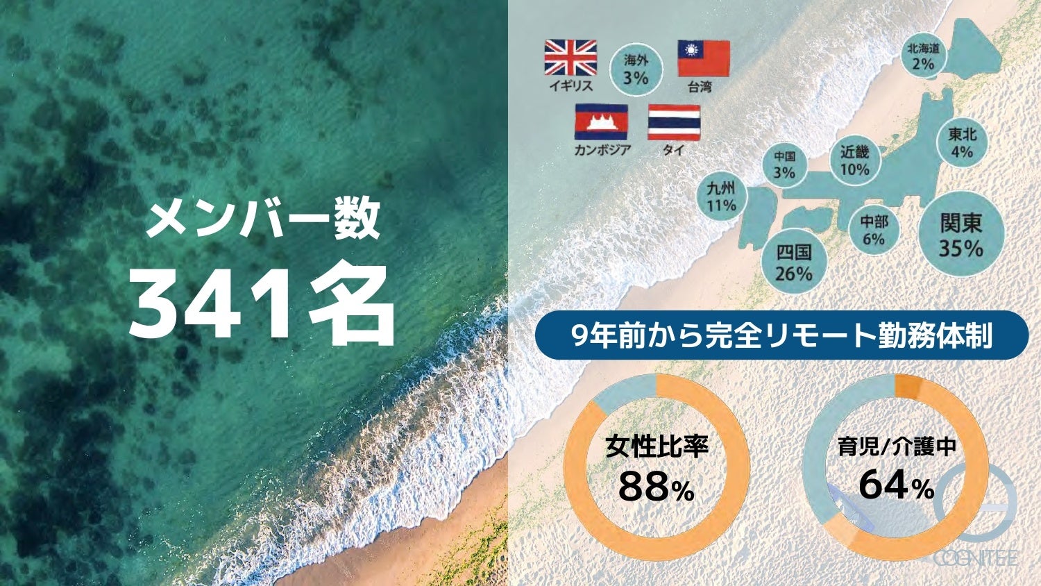 2018年には代表の出身地である徳島県にサテライトオフィスを設置。リアルで交流可能な場を設けることで地元人材の活用に成功しており、現在26%が四国在住者です。さらに2022年6月に福岡県福岡市の託児付きコワーキングスペース「CREATIVE ROOM」に新拠点を設置しました。
