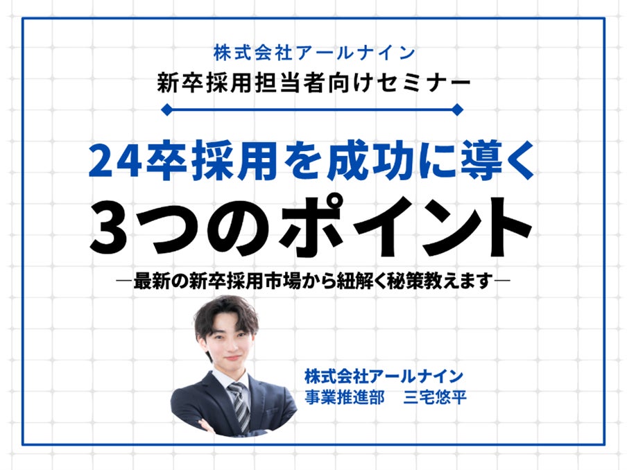 採用から定着まで企業の成長を支援する株式会社アールナイン(本社:東京都港区、代表取締役:長井亮)は、オンラインセミナー「24卒新卒採用を成功に導く3つのポイント~最新の新卒採用市場から紐解く秘策教えます~」を2023年3月30日(木)に開催いたします(https://jinjibu.jp/seminar/detl/106758/)。