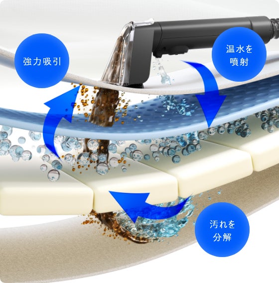 Turboは水と熱の力のみで汚れを浮かし、浮いた汚れを吸引して除去。