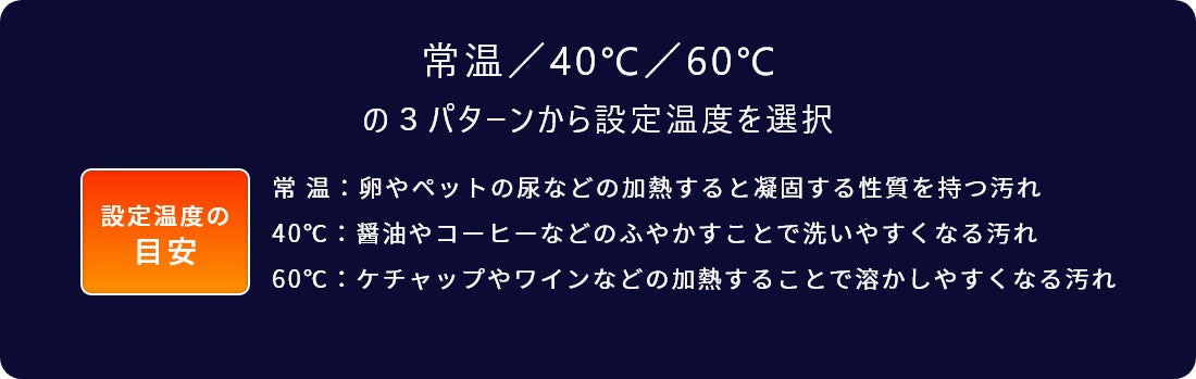 特長1:最大60℃の温水でしつこい汚れもカンタン除去。