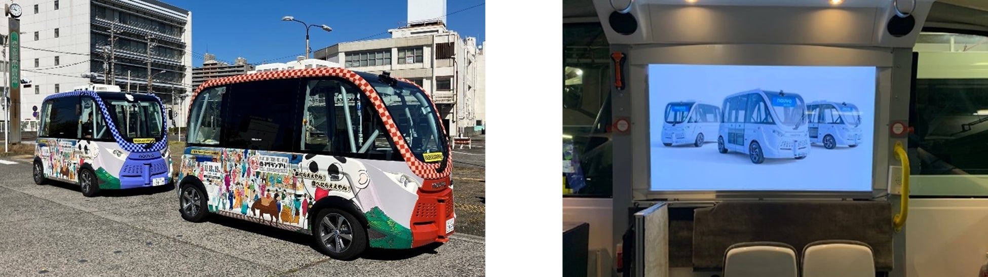 本実証実験では、昨年9月と同様の中央通りにて、ハンドル・アクセル・ブレーキのない自動運転EVバスであるGAUSSIN MACNICA MOBILITY社の「ARMA(アルマ)*3」を2台運行し、昨年同様日本信号からの技術協力を受けて「信号協調」を行い、信号交差点付近での自動走行技術検証を実施します。また、2台の車両内部には半透過型のディスプレイを設置し、プロモーション動画を配信することで移動価値の検証も実施します。さらに、バス停付近ではAIが自動音声案内をしたり、乗車中のお客様の行動に合わせた音声案内を発信する検証を行うなど、より社会実装を意識した実証実験を行っていきます。