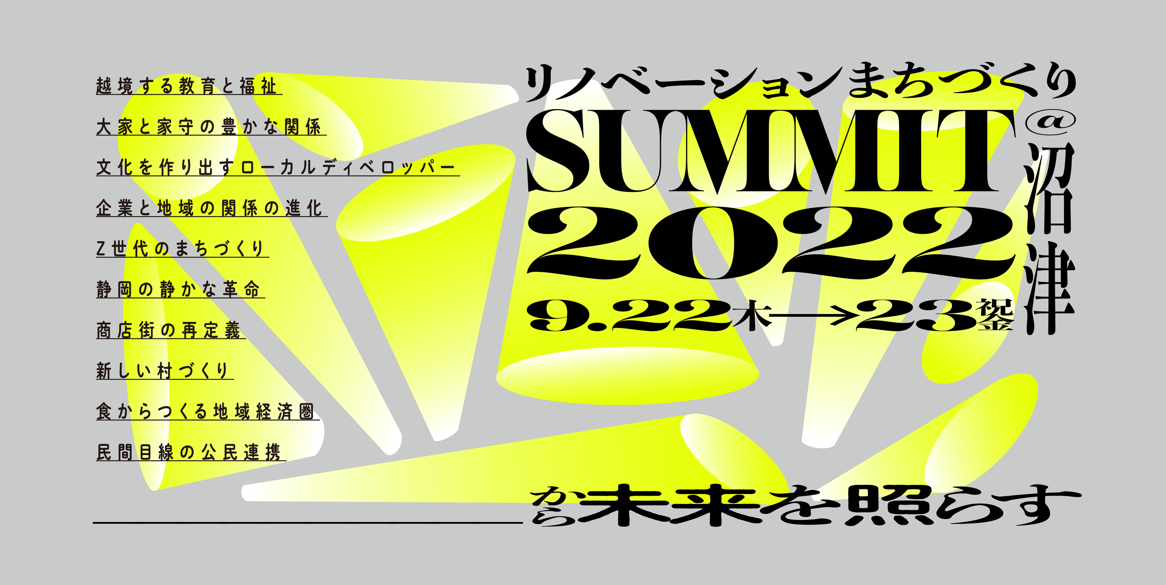 2011年に北九州市ではじまり、全国90を超えるまちで取り組まれてきたリノベーションまちづくりは、それぞれの地域の特性や時代の変化にあわせて、各地で次々と進化を遂げてきました。コロナ禍は各地に厳しい状況ももたらしましたが、そんな状況を逆手にとり、新たな取り組みをしてきた人たちもいます。 今回、9/22(木)&23(金・祝)の2日間で予定されている「リノベーションまちづくりサミット」のテーマは「未来を照らす」。当日は、この時代の変化を10のテーマに凝縮し、各テーマを全国各地から50名近くのゲストをお迎えして、語り合います。会場は、リノベーションまちづくりの先進都市の一つ、静岡県沼津市を選びました。沼津のまちを巡るオプションツアーも予定しています。 最前線で活躍する人たちが、いま何を考え、何を行動しているのか。各地の事例を当事者とともに紐解きながら、時代の先端を感じていただける2日間です。公・民を問わず、ぜひご参加ください。