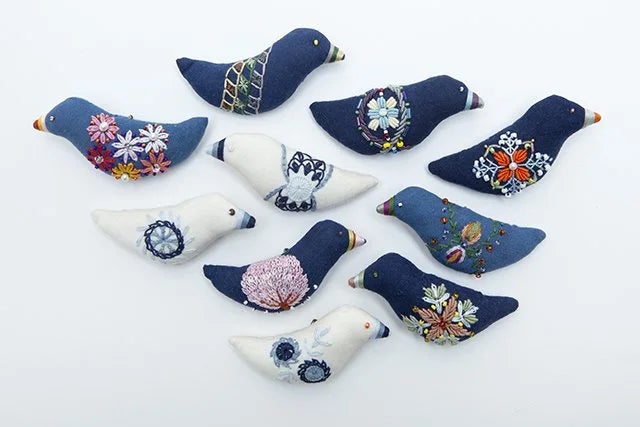 <みどころ3:藍染と刺繍「佐々木さんの小鳥」と「MARUIRO」オーナメントづくり>