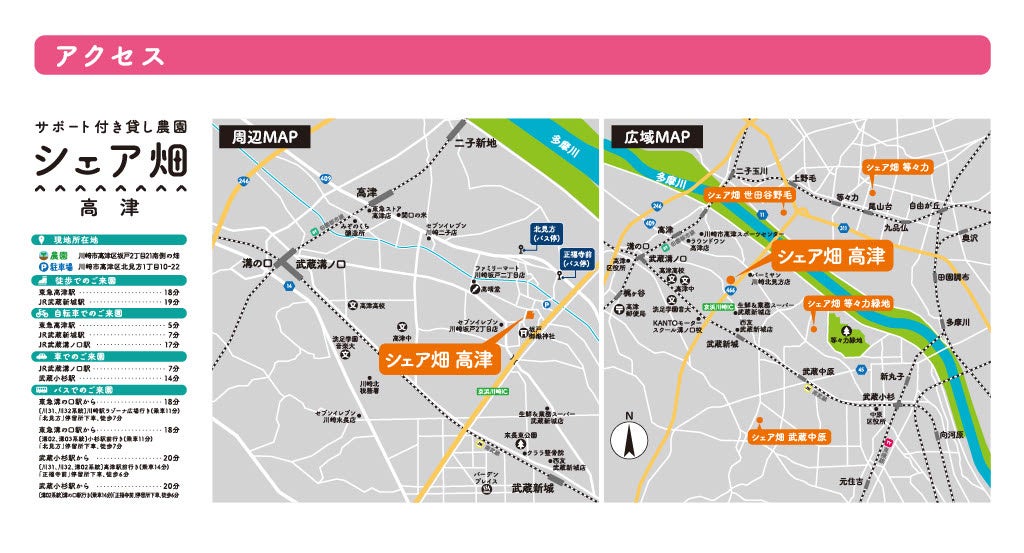 JR南武線・武蔵溝ノ口駅から7分、JR南武線、東急東横線、JR横須賀線・武蔵小杉駅から14分 ※農園近隣に農園利用者用の駐車場有
