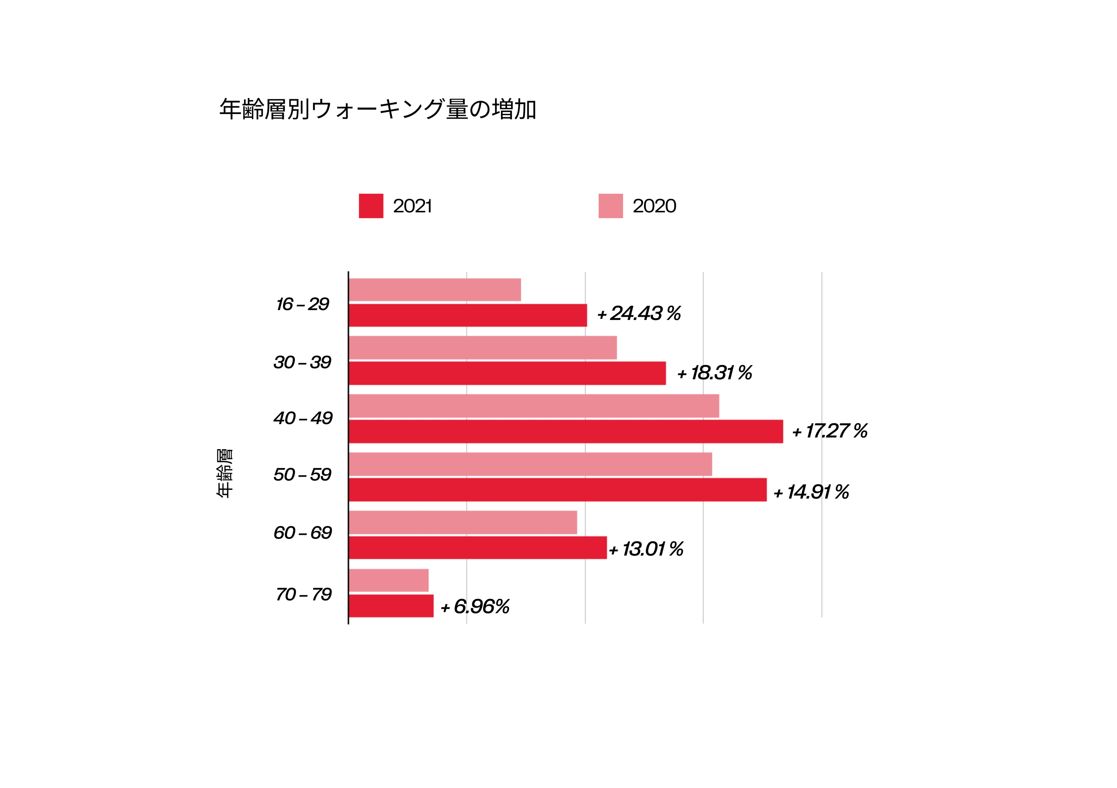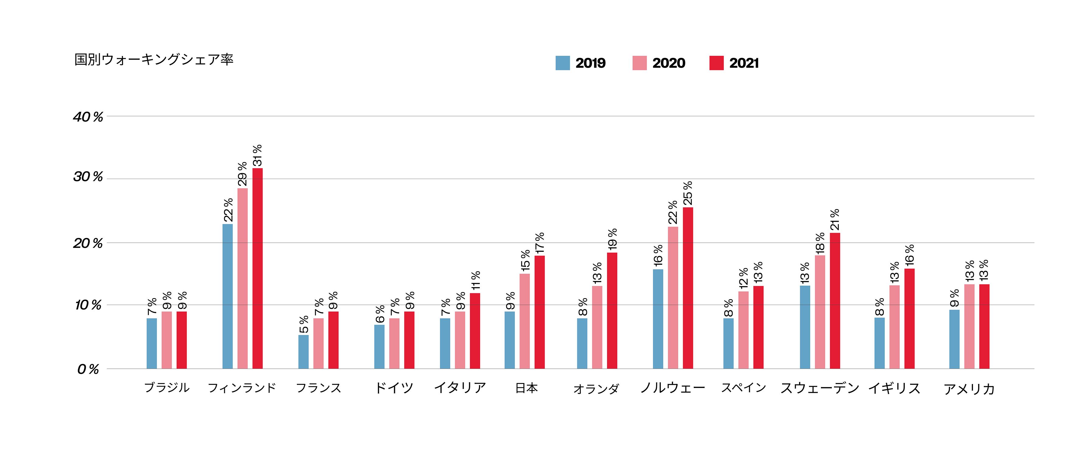 スポーツ用ウェアラブルデバイスと心拍数テクノロジーの世界的リーディングカンパニーであるポラール・エレクトロ(本社:フィンランド ケンペル、代表取締役Sander Werring)は、2019年から3年間のポラールユーザーのデータを調査し、日本のユーザーのウォーキング人口が増えていることが分かりました。2019年では日本のユーザーが行った全体のスポーツのうちウォーキングが占める割合は9%でしたが、2020年は15%、2021年は17%となり、新型コロナウイルスの感染拡大に伴い、ウォーキングを選ぶユーザーが増えていることが明らかになりました。なお、分析はすべて、各個人の識別情報を除外した匿名化したポラールユーザーのデータを用いています。