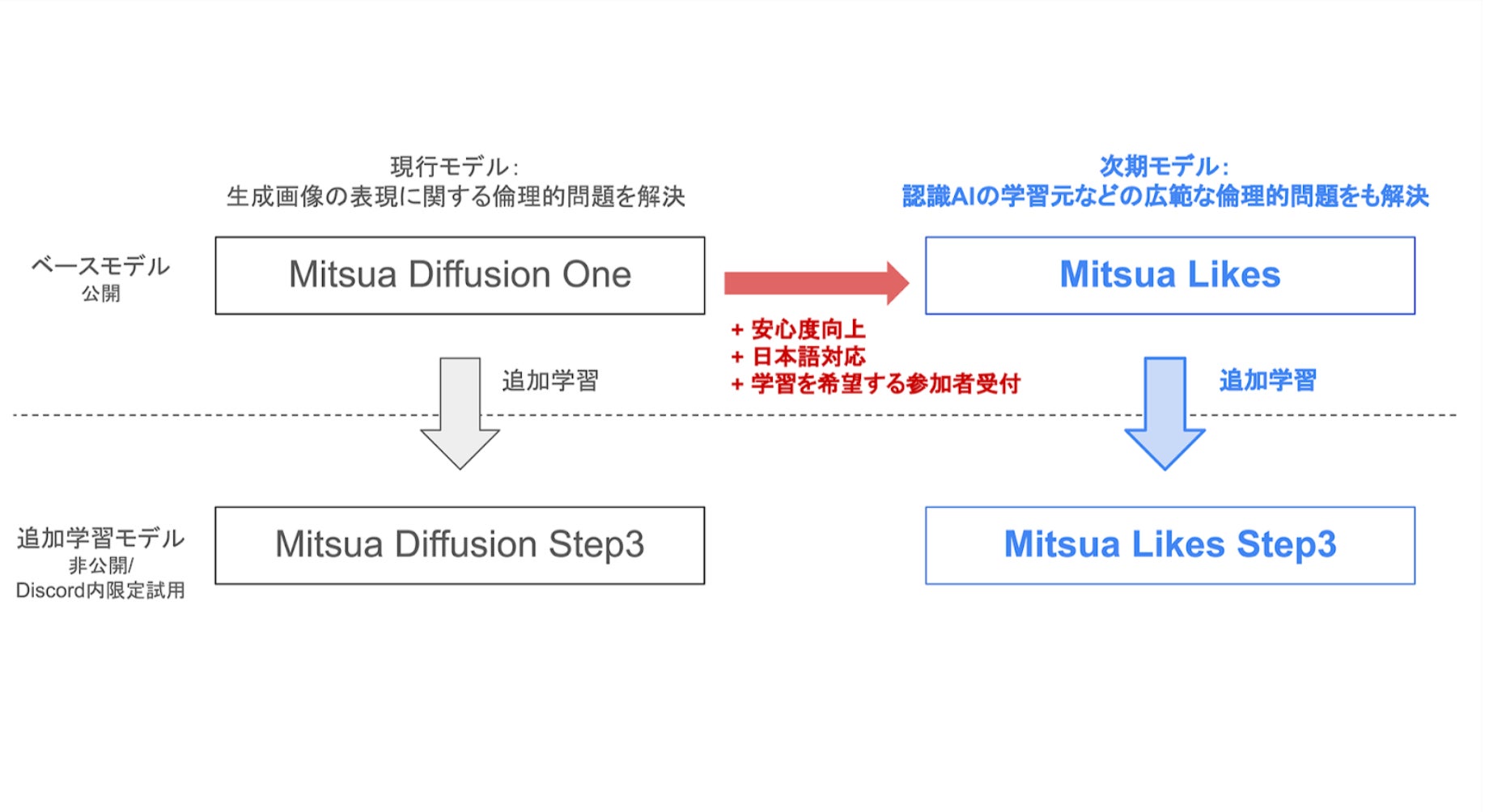 「Mitsua Likes」とは、権利的にまたは心理的にクリーンなデータのみで、すべてのモジュールを完全にゼロから学習する予定の日本語/英語バイリンガルの画像生成AIモデルです。現行のMitsua Diffusion Oneと同様に、ミツアちゃんの活動のベースモデルとなり、モデルの公開を予定しています。そして、オプトイン参加者の画像で追加学習したモデルは「Mitsua Likes Step3」となり、こちらはミツアちゃんのSNS活動で使用されるほか、学習参加者専用Discord内で非商用での試用が可能です。こちらのモデル自体は公開はされません。(学習に参加するモデルは選択可能。詳細は上記リンク「Mitsua Likes 詳細」をご参照ください。)