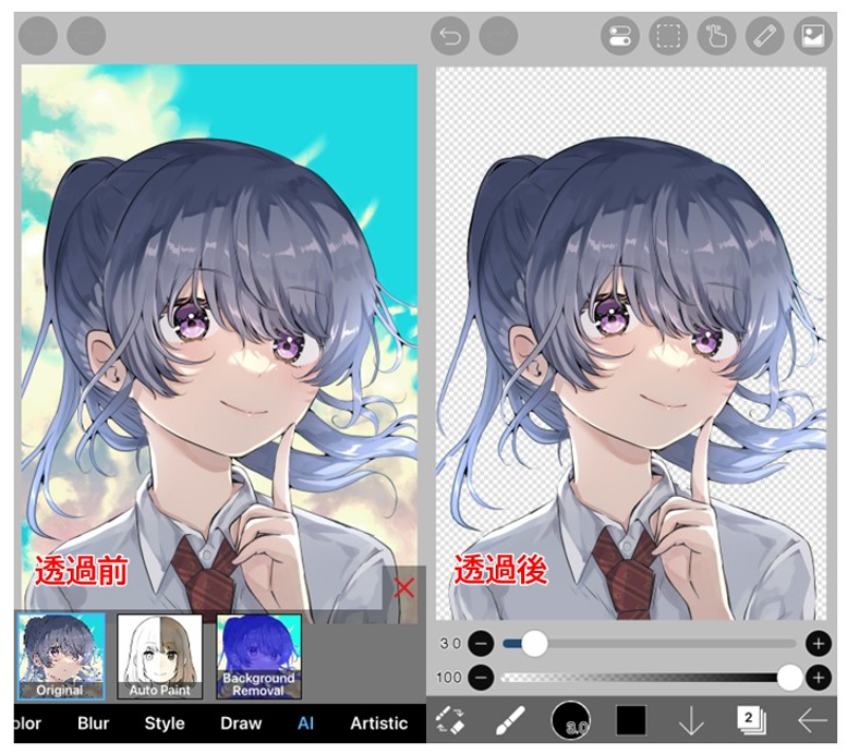 AIによる自動色塗り機能、AI超解像度に次ぐ、人工知能を用いた新機能の第三弾が「背景透過機能」です。人物や