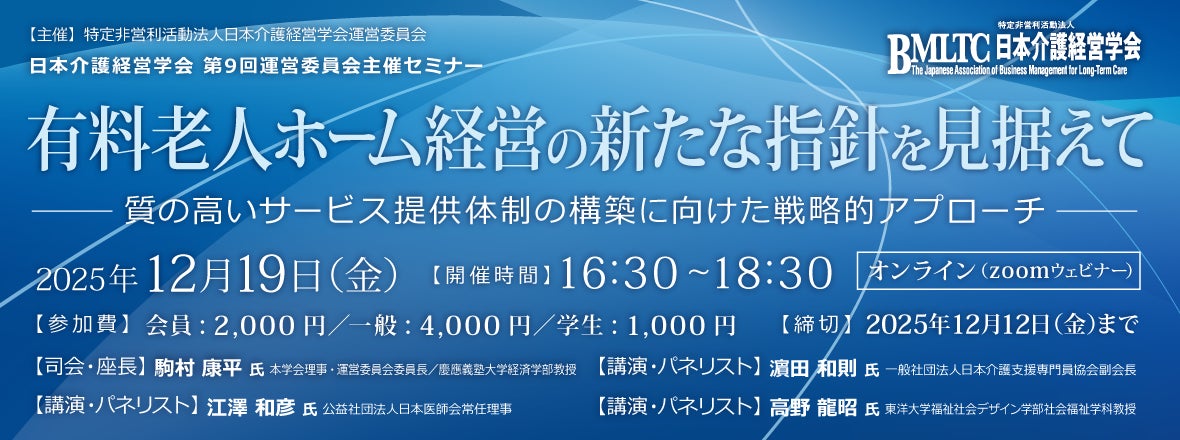 日本介護経営学会が2025年12月19日に「有料老人ホーム経営の新たな指針」をテーマにオンラインセミナーを開催。専門家が制度変化に対応した経営戦略や、質の高いサービス提供の在り方について議論します。