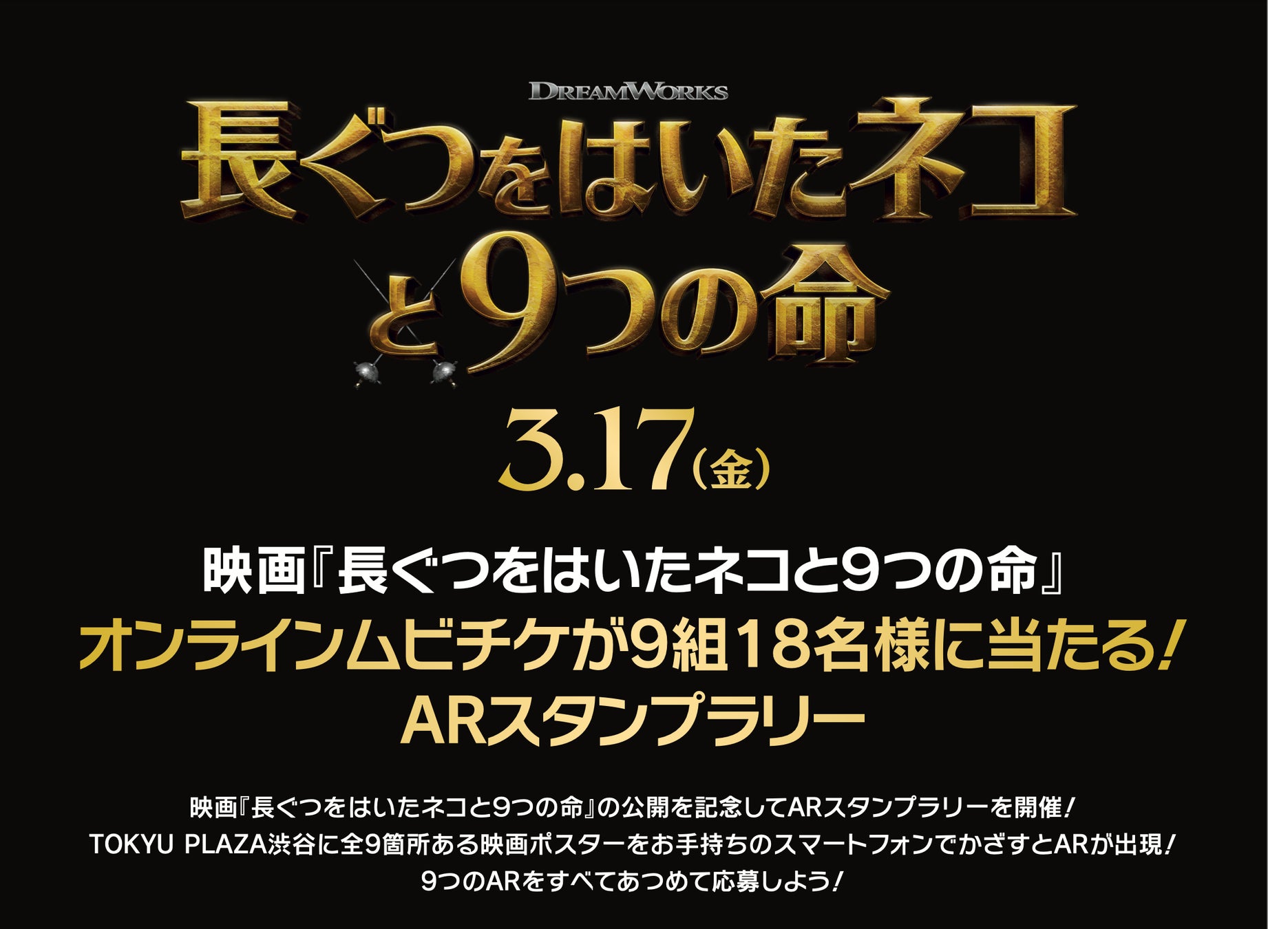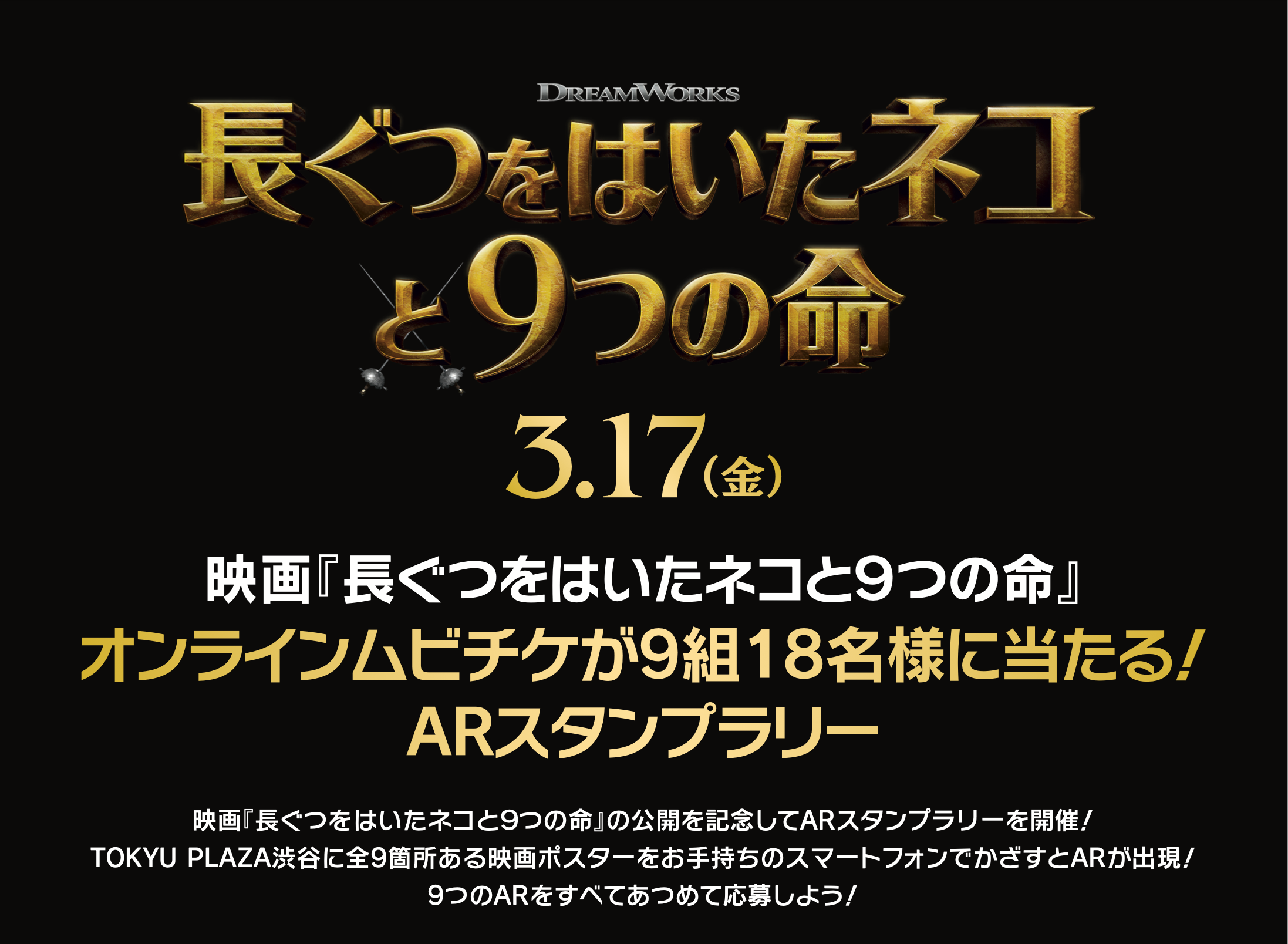 2階イベントスペースで展開される2023年3月17日(金)公開の話題の映画『長ぐつをはいたネコと9つの命』にちなんで、各フロアの「渋にゃんだらけ」スペース9ヶ所を回るARスタンプラリーを実施! 9ヶ所に設置されたポスターをスマホでよみこむと、オリジナルコンテンツ(デジタルスタンプ)を寄与。9つ集めて応募フォームに飛ぶと、抽選で映画『長ぐつをはいたネコと9つの命』オンラインムビチケ(映画前売券)9組18名様が当たります。