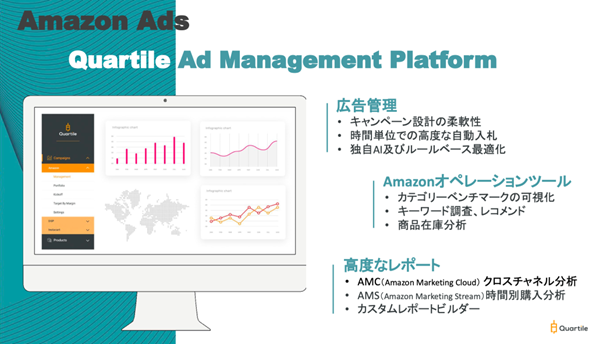 リテールメディアへの広告投資が加速する中、クォータイルの最先端技術は、6つの特許を持つ独自AIによる入札最適化を通じて広告管理を革新することで名高く、特に「ASINレベルでのキャンペーン自動作成・管理」「AIによる自動入札の最適化」「データ分析基盤との連携」の点で米国では高い評価を得ています。この度のサービス開始により日本国内のAmazon出店企業、および広告代理店でも日本語対応管理画面および日本語対応の専任窓口を通じての利用が可能となります。クォータイルの広告最適化技術は、Amazonサイト内のスポンサー広告のみならず、Amazon DSP配信にも対応。またAMC(Amazon Marketing Cloud)との連携によるビジュアライズされたクロスチャネル分析レポートのご提供も行います。