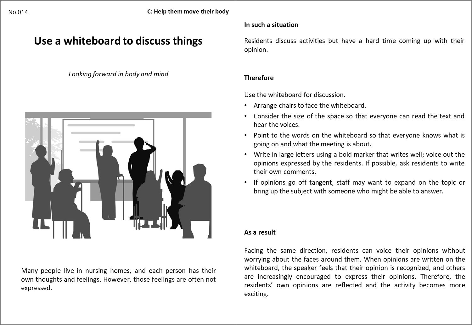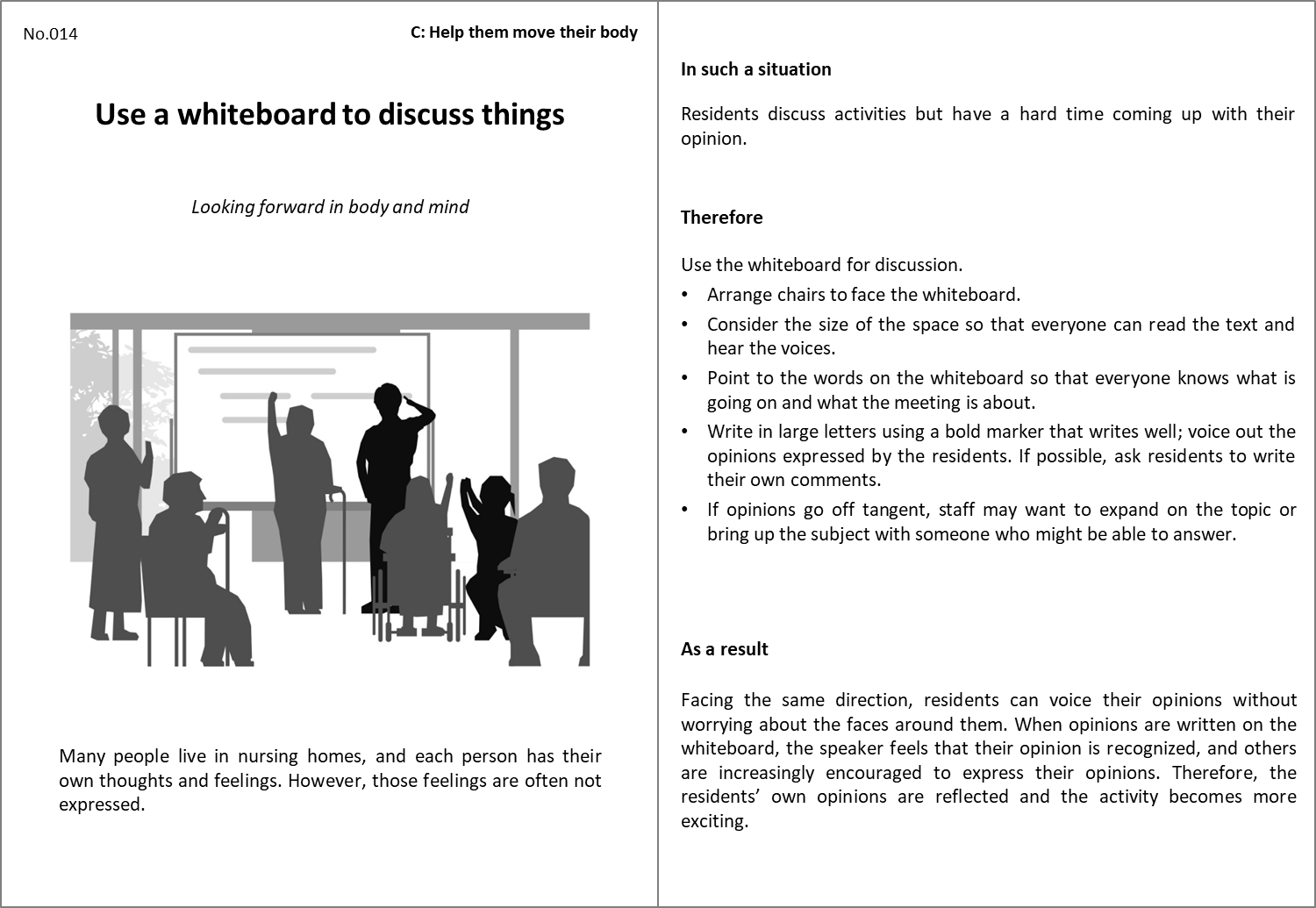 認知症ケアメソッド®とは、ベネッセスタイルケアの300を超える高齢者向けホームでの、認知症の方をはじめとする様々なご入居者様にうまく寄りそうことのできた事例を集め、うまくいった理由や背景を紐解き共通項でまとめ、パターン・ランゲージ注2の手法を用いて「ノウハウ」「コツ」といった実践知を言語化することで、再現可能にしたものです。全40個のメソッドは、職員が「できそう」「やってみたい」と思い、すぐに具体的な行動に移せるよう、ホームとご入居者様を取り巻く状況と、その状況において起こりがちな問題、その問題を解決に導くための具体的な方法、その方法によってもたらされる結果を、わかりやすく記述しています。冊子とカードの形で配布して各ホームでの実践をスタートさせたうえで、さらなる活用を促進するために活用講座をスタートしました。