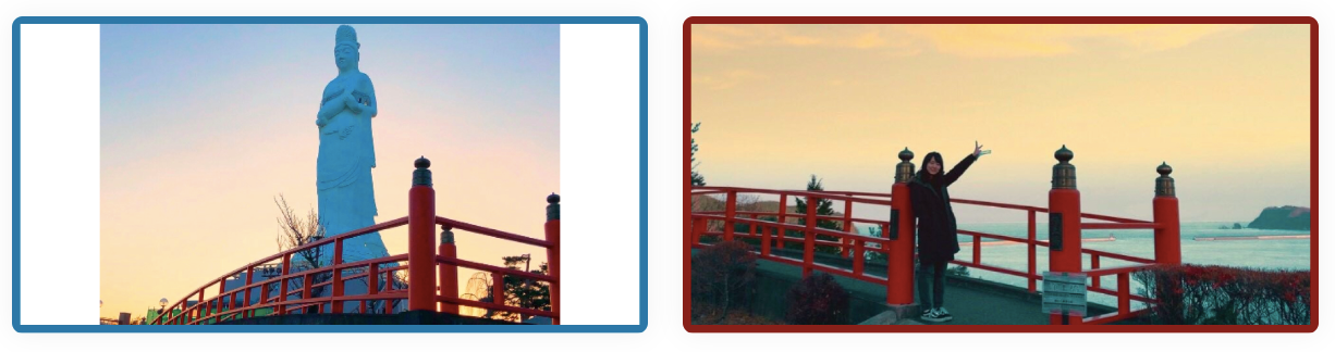 左が、バブルの頃から続く日本人的な写真の撮り方です。ここを訪れる日本人は、潜在的に釜石大観音と、橋を撮影します。そして、その写真が各種のSNSや、友人 / 家族へ拡散されていきます。