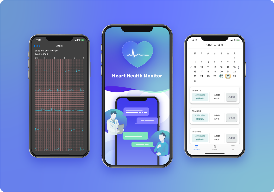 当社AI「NIHA-HF」及びソフトウェアでは、Apple Watchユーザーの方々が計測した心電図に対し、心房細動の検知結果、心拍数、及び心電図を、カレンダー画面から整理されたUIで確認できることだけではなく、一部の参加者に対し、東大病院の研究チームがメール・電話等でフォローアップを行う予定です。