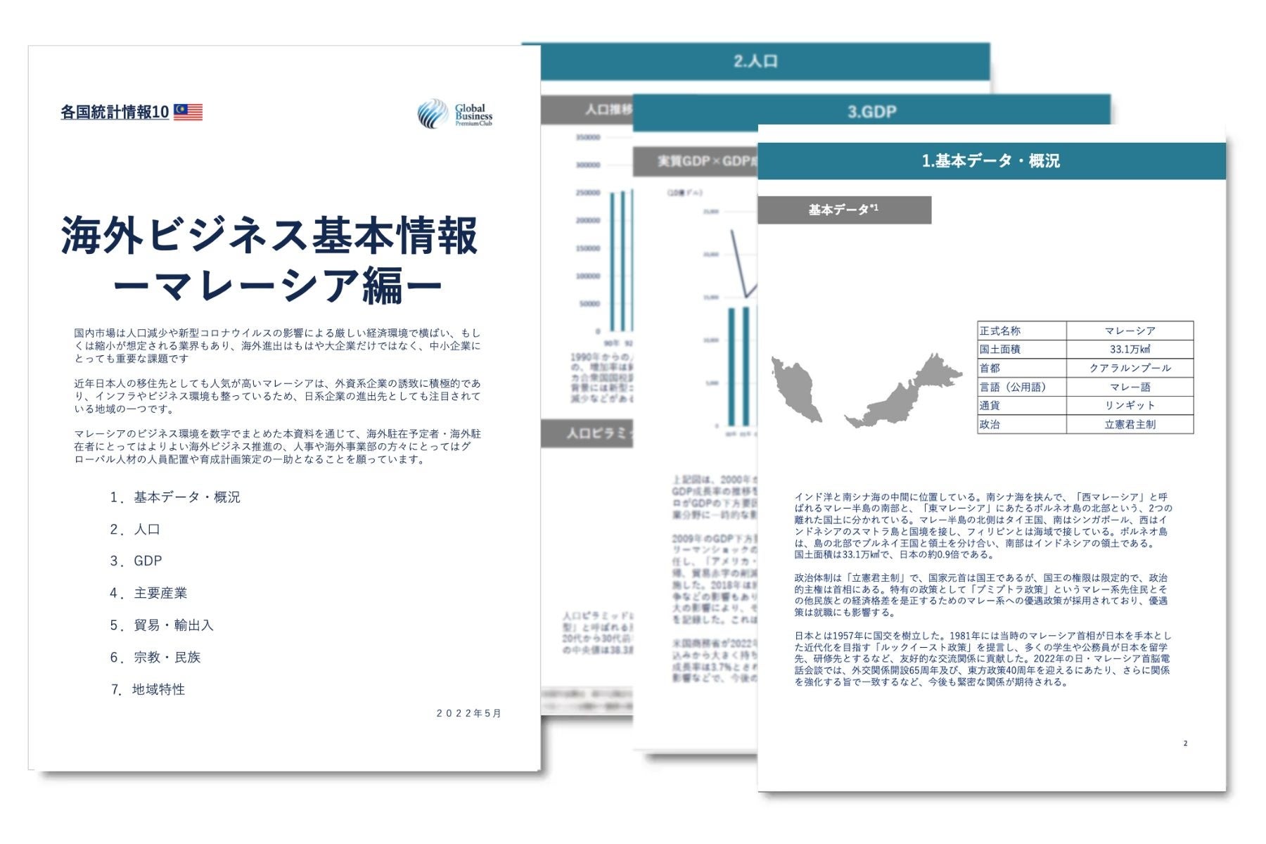 マレーシアへの海外進出を検討中の企業へ、市場調査の第一歩に必要となるビジネス環境(人口、GDP、主要産業、貿易・輸出入、宗教・民族/人種、地域特性)に関するレポートをまとめました。
