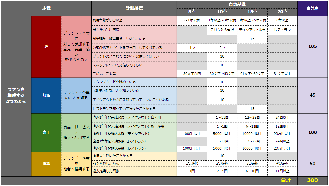 それを可能にするために、消費者行動やファンの声を「愛」「知識」「売上」「推奨」の4つの観点で点数化しファン度合いを計測、SNS投稿やアンケート回答からインサイトを明らかにします。