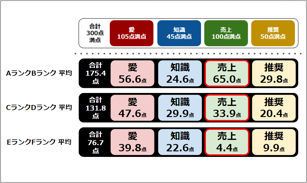 ランクが下がる毎に「売上」の点数が大幅にダウンの傾向。売上が下がることで、「推奨」も下がる傾向があるため、売上貢献度の改善を目指した施策をご提案。