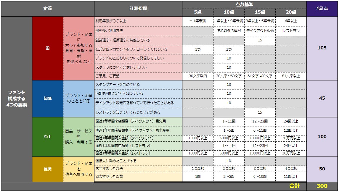 それを可能にするために、消費者行動やファンの声を「愛」「知識」「売上」「推奨」の4つの観点で点数化しファン度合いを計測、SNS投稿やアンケート回答からインサイトを明らかにします。