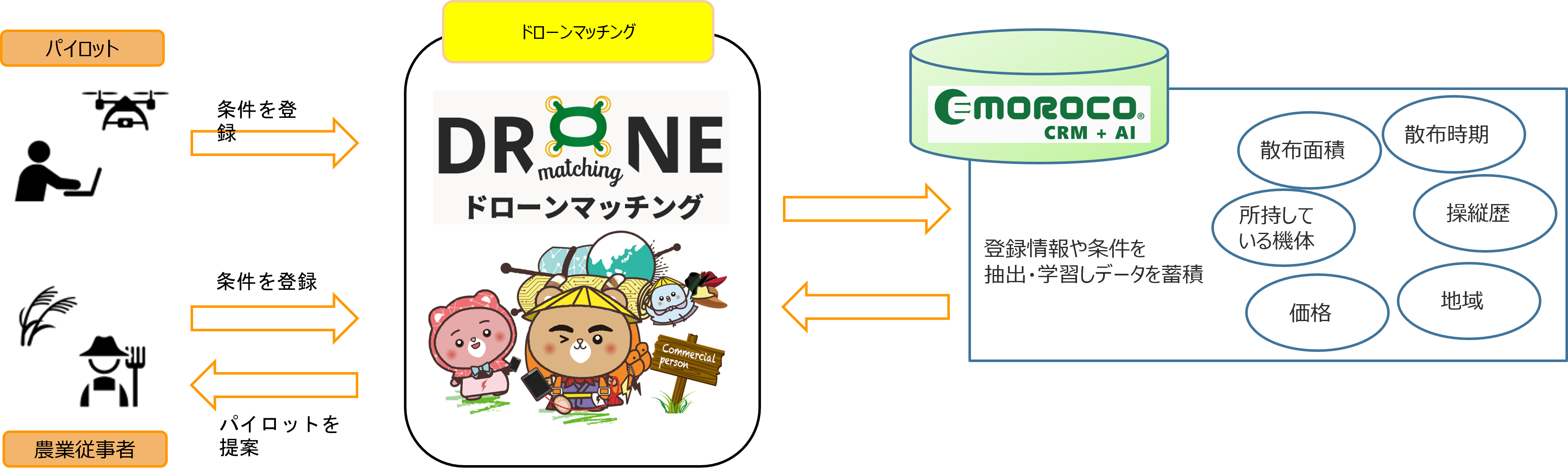 アーカス・ジャパンが提供するドローンマッチングサービスは電子行商人(EM)サイトプラットフォームであるArcuryをベースとしておりますため、CRM(顧客管理)とAI(人工知能)が一体となり、ドローンの仕事を依頼したい方と受けたいドローンパイロットとを最適にマッチングさせる専用のアルゴリズムを備えたサービスとなっております。