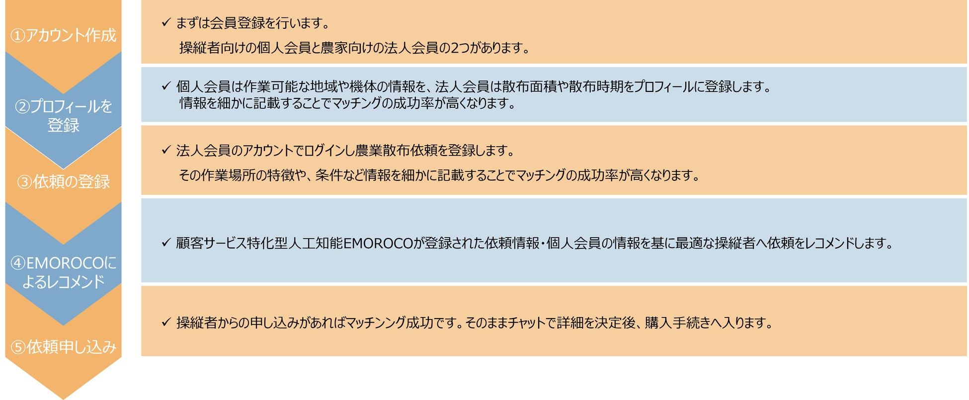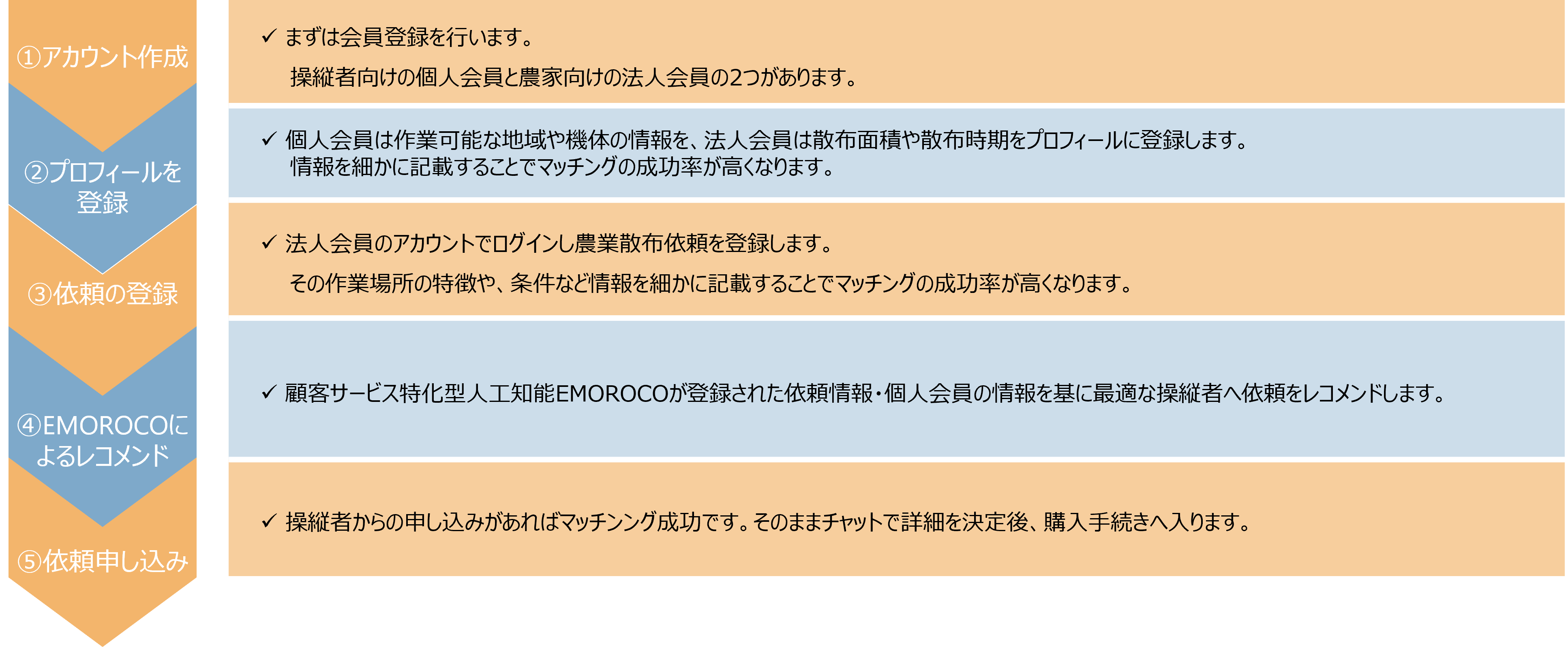 今回提供するArcury for Matchingは「ドローンマッチングサービス for 農業」として農業散布を依頼したい農家向けに機能開放を行っており、農業散布や農業におけるドローン利用を依頼したい農業従事者と最適な技術と経験を有したドローンパイロットをマッチングします。