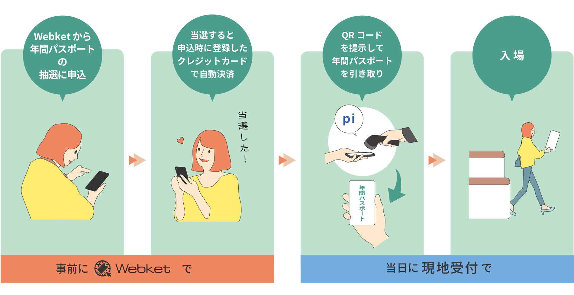 年間パスポート購入希望者は公式サイトからオンラインで申込みを行い、当選が確定すると申込時に登録したクレジットカードで自動決済が完了します。決済後に発行されるQRコードを提示し、現地窓口で年間パスポートを引き取った後に入場処理を行うことができます。