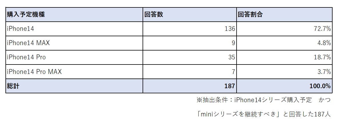 また、小型モデルの「mini」を廃止すべきではないと回答した人のうち、iPhone14シリーズの購入予定・検討中なのは187名。その187名のうち136名がiPhone14を購入予定と回答しました。