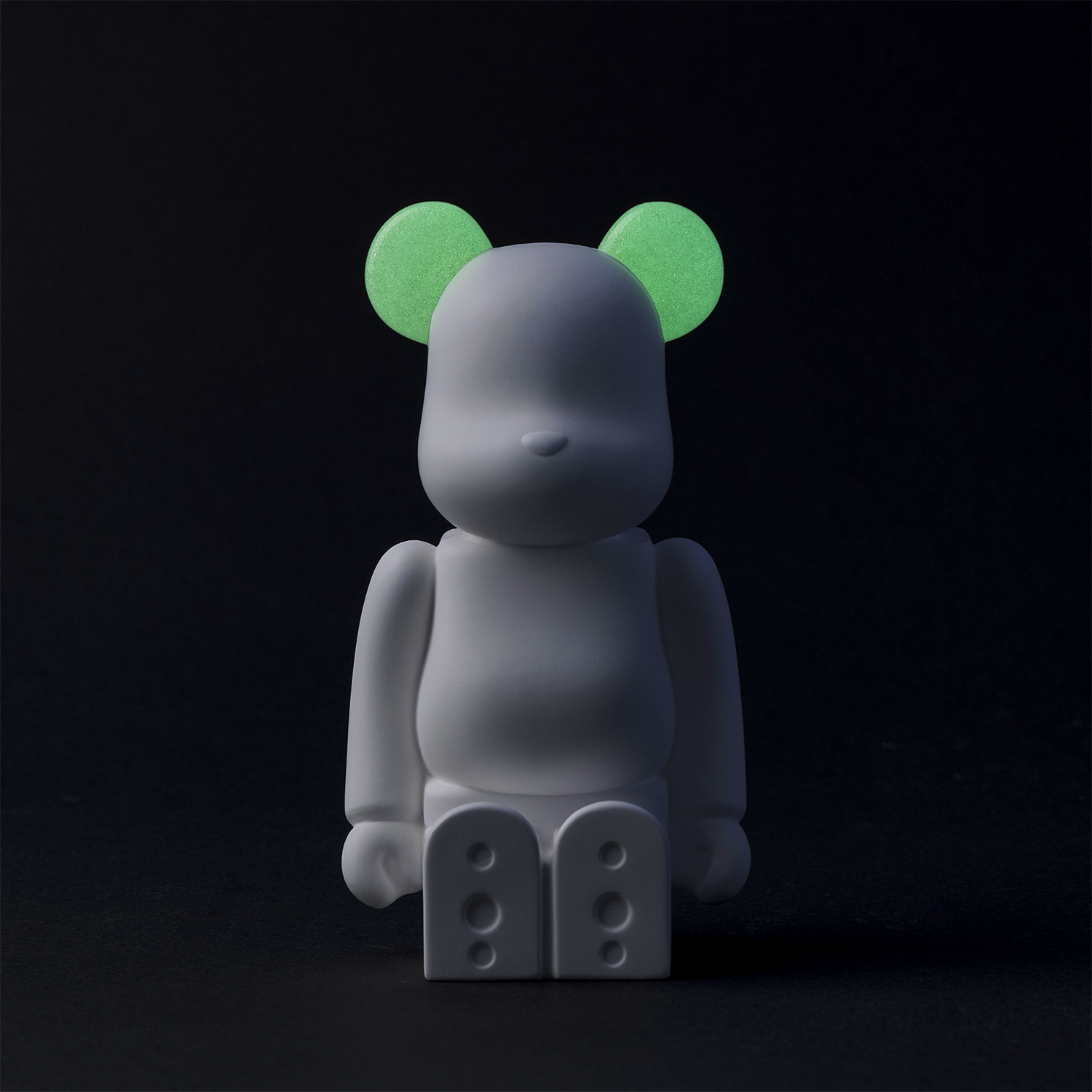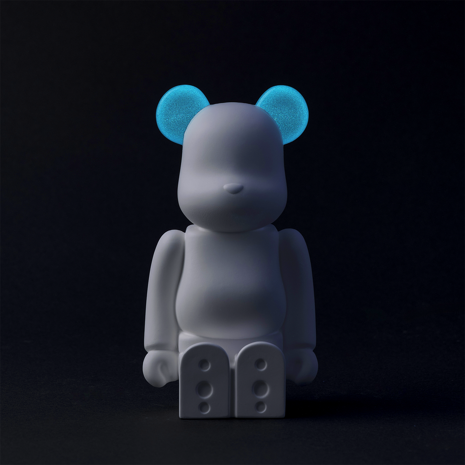 蓄光素材により、太陽や蛍光灯などの光を吸収・蓄積し、暗い場所で見ると耳が発光するBE@RBRICK AROMA ORNAMENT
