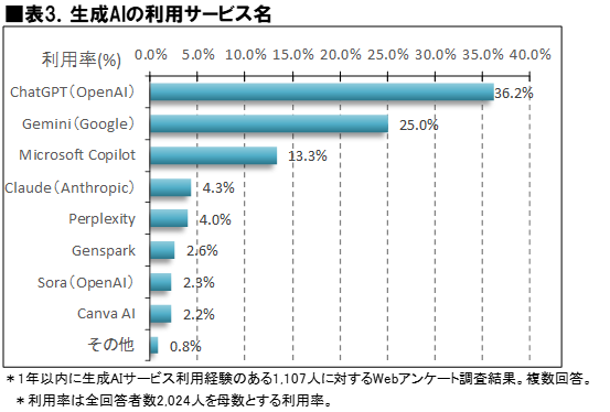ICT総研が2026年2月に実施したアンケート調査では、2,024人のアンケート対象者のうち54.7%の回答者が一年以内になんらかの生成AIサービスの利用経験があると回答した。サービス利用経験者の中で最も利用率が高かったのはChatGPT(OpenAI)であり、全体の36.2%を占めた。次いで、Gemini(Google)が25.0%、Microsoft Copilotが13.3%、Claude(Anthropic)が4.3%、Perplexityが4.0%、Gensparkが2.6%、Sora(OpenAI)が2.3%、Canva AIが2.2%となっている。「その他」と回答した者は0.8%であった。