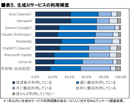 また、「週に数回利用」を含めた週に数回以上の利用比率でみると、Sora 73.9%、Genspark 71.7%、Gemini 71.6%、Claude 70.4%、Perplexity 69.2%と、上位サービスではおおむね7割前後に達している。一方、ChatGPTは62.8%、Microsoft Copilotは62.3%、Canva AIは55.5%であった。