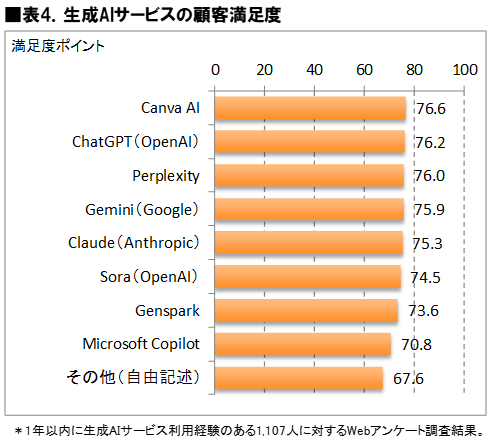 主な生成AIサービスの利用者満足度を100点満点換算の満足度ポイントに換算すると、Canva AI の満足度が最も高く76.6ポイントであった。次いで、ChatGPT(OpenAI)が76.2ポイントで2位、Perplexityが76.0ポイントで3位となった。Gemini(Google)は75.9ポイントで4位、Claude(Anthropic)が75.3ポイントで5位にランクインしている。Sora (OpenAI)は74.5ポイントで6位、Gensparkは73.6ポイントで7位、Microsoft Copilotは70.8ポイントで8位となった。