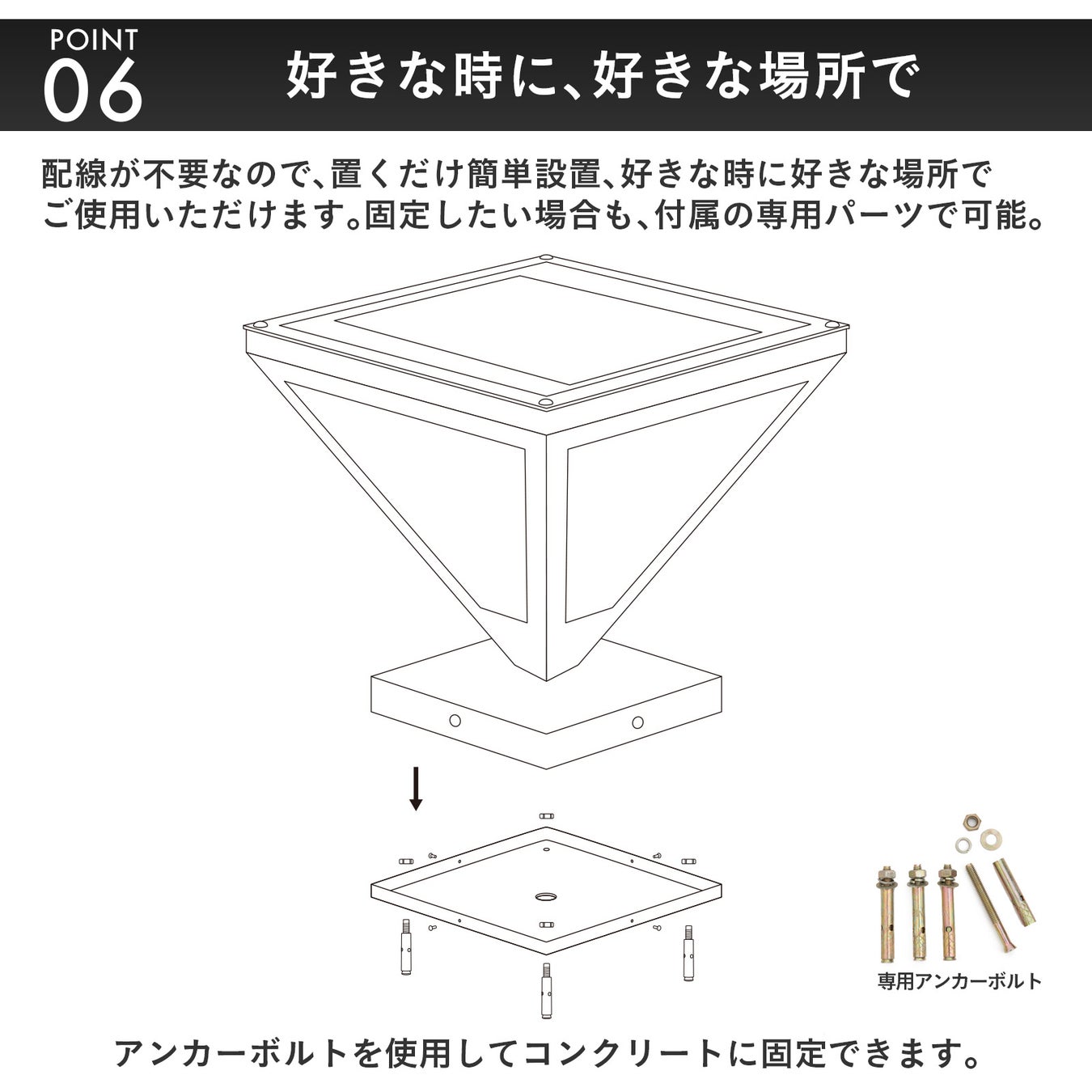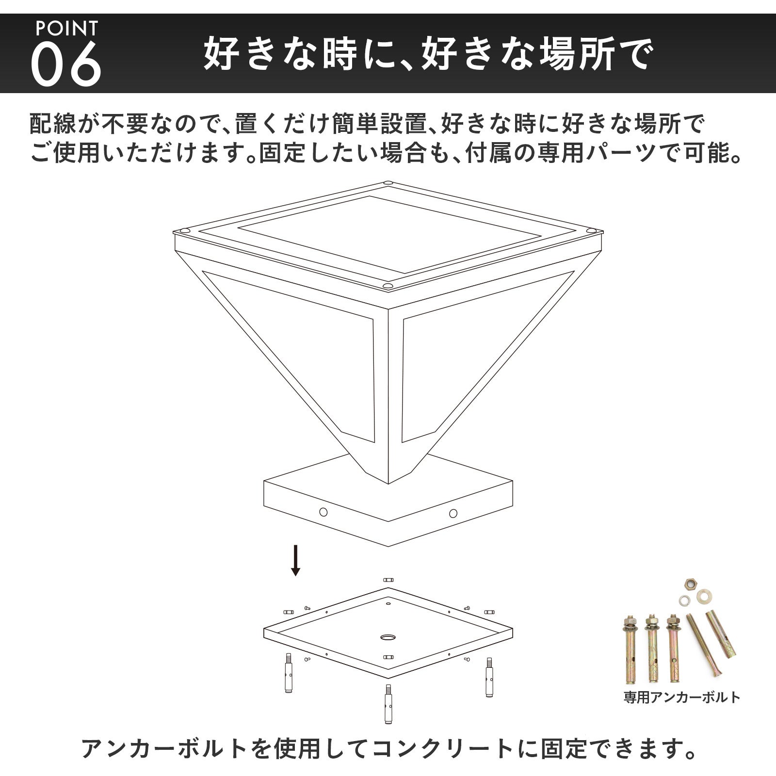 ソーラーライト充電で配線は不要。置くだけの簡単施工で設置も楽々。付属の専用パーツで施工することで、しっかり固定させることも可能です。