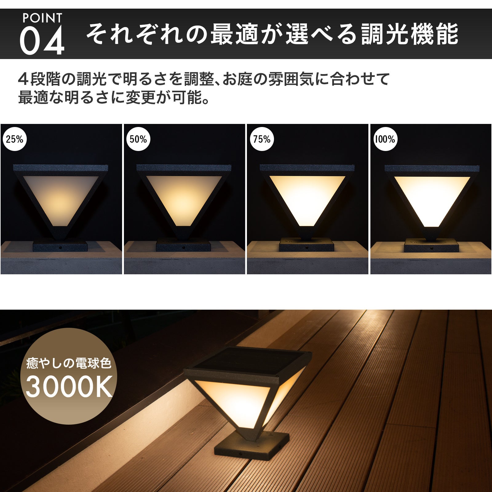 調光では4段階の明るさが選べます。お庭の雰囲気にあわせて最適な明るさに変更できます。